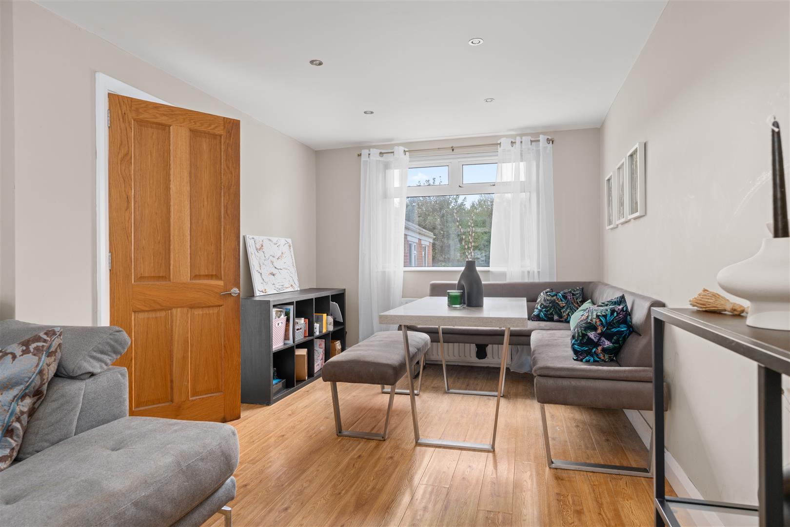 Glazed Upvc entrance door with matching side light; wood laminate floor; understairs storage cupboard.