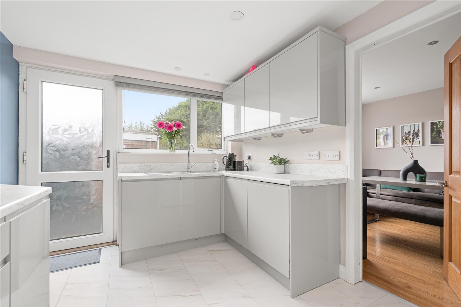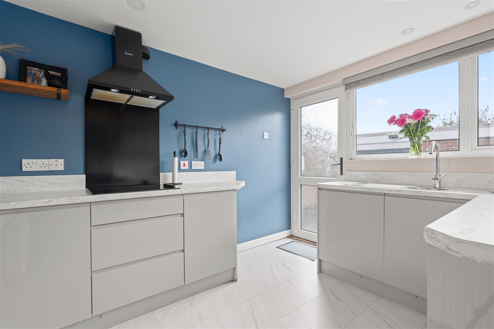 Contemporary fitted high and low level cupboards incorporating 1½ tub stainless steel sink unit with mixer tap; integrated electric oven; Hotpoint 4 ring ceramic hob; Indesit extractor hood; Indesit fridge; Indesit dishwasher; formica worktops with matching upstands; tile effect laminate floor; recessed lighting; glazed Upvc door to rear.