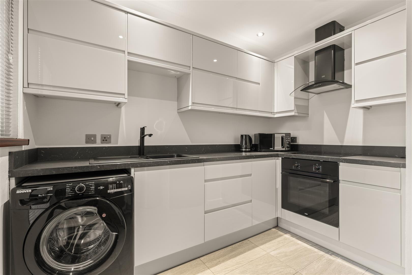 Good range of modern high and low level cupboards and drawers incorporating single drainer sink unit with mono mixer tap; integrated Logik electric under oven with Candy 4 ring ceramic hob; extractor hood over; space for fridge / freezer; space and plumbing for washing machine; laminate worktop with matching upstands; tiled floor; recessed spotlights; glazed Pvc door to rear.