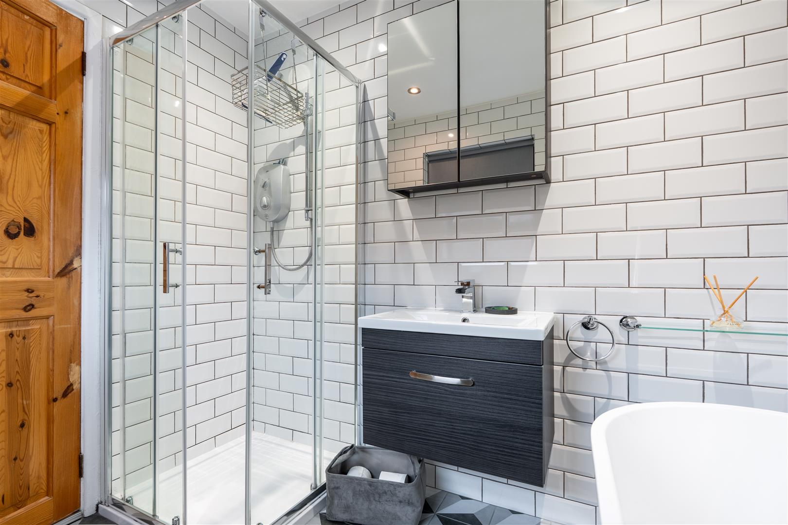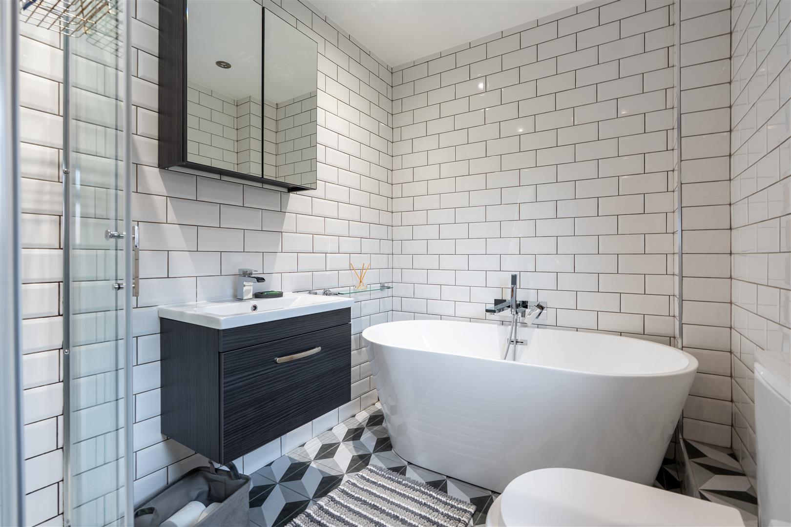 Modern white suite comprising freestanding oval shaped bath tub with mono mixer taps and telephone shower attachment; separate shower cubicle with Mira Vie electric shower unit and wall mounted telephone shower attachment; fitted sliding shower doors; wall mounted wash hand basin with mono mixer tap and vanity unit under; close coupled WC; tiled walls and floor; recessed spotlights; towel radiator.