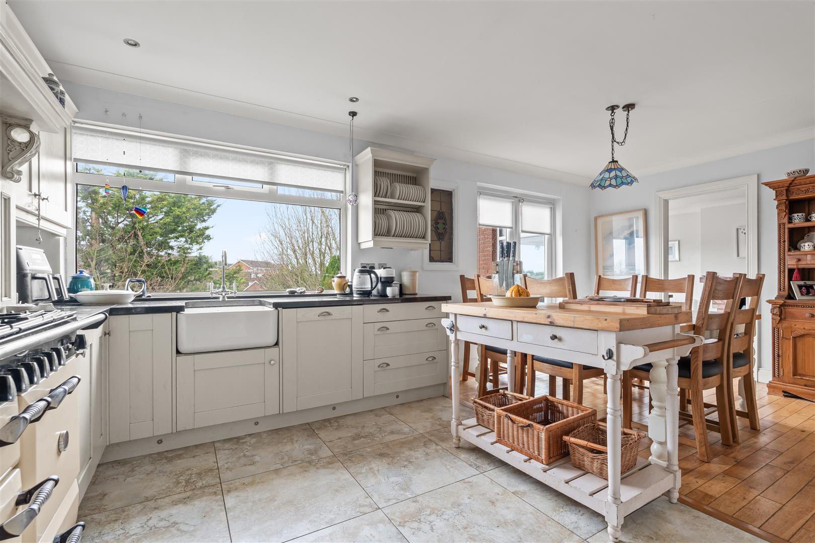 Glazed Belfast sink with mixer tap; built-in high and low level cupboards; tiled floor; space and plumbing for washing machine and tumble dryer.