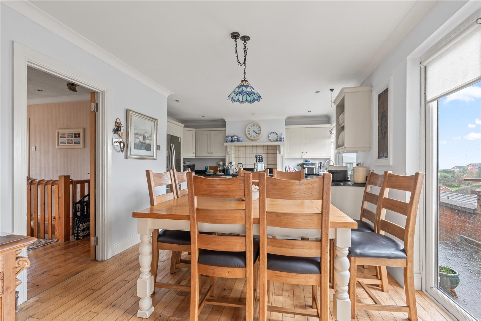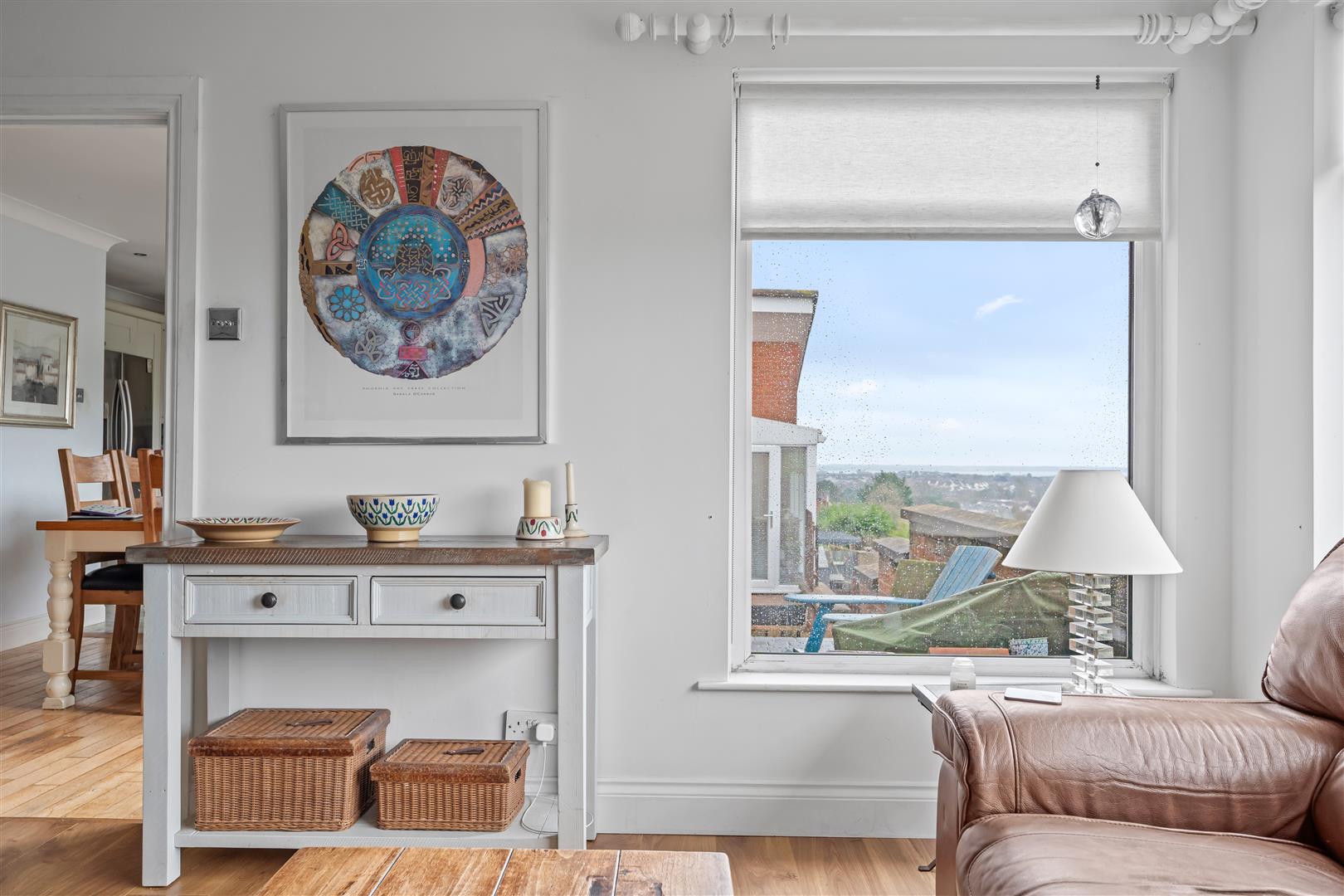 Glazed uPVC entrance door with matching side light; wood strip floor; corniced ceiling; access to roofspace; built-in storage and cloak cupboard.