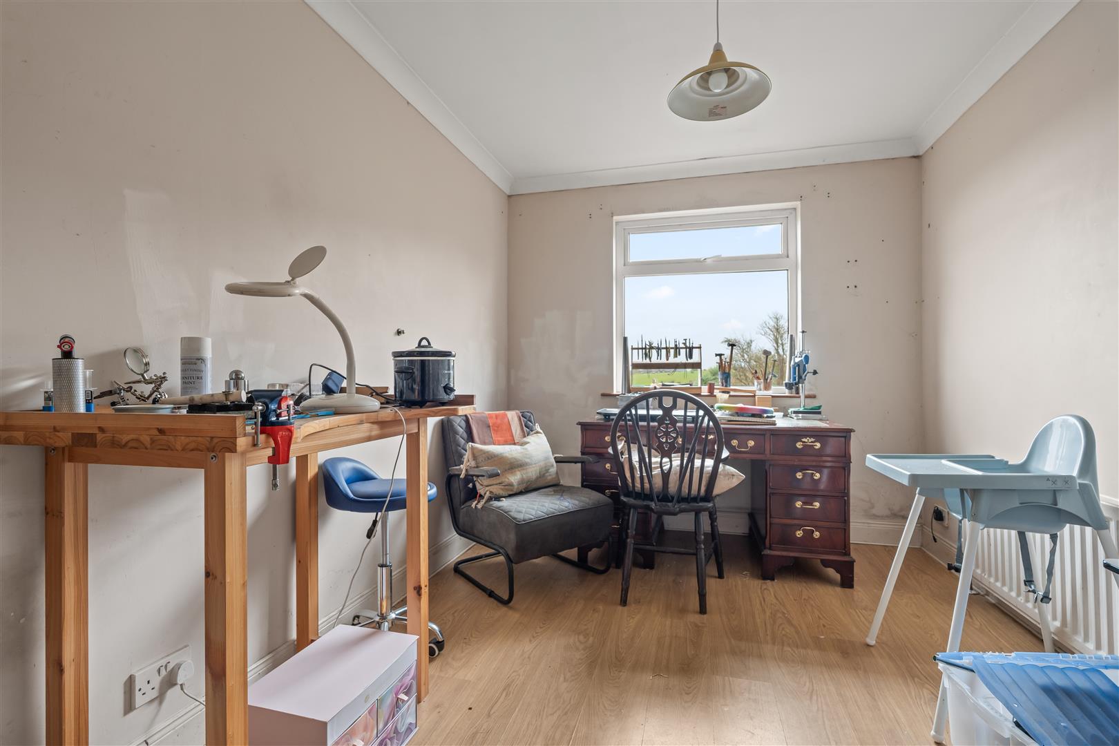 Wood laminate floor; corniced ceiling.