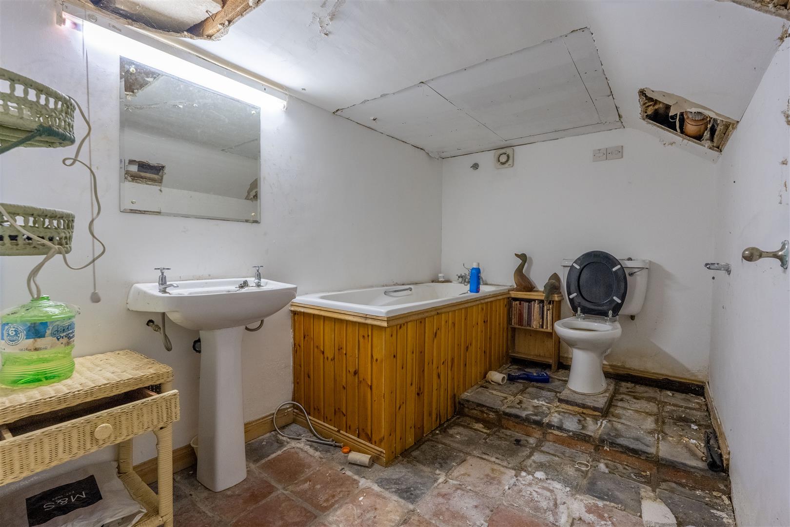White suite comprising pine tongue and groove panelled bath with mixer tap; pedestal wash hand basin; low flush wc; tiled floor.