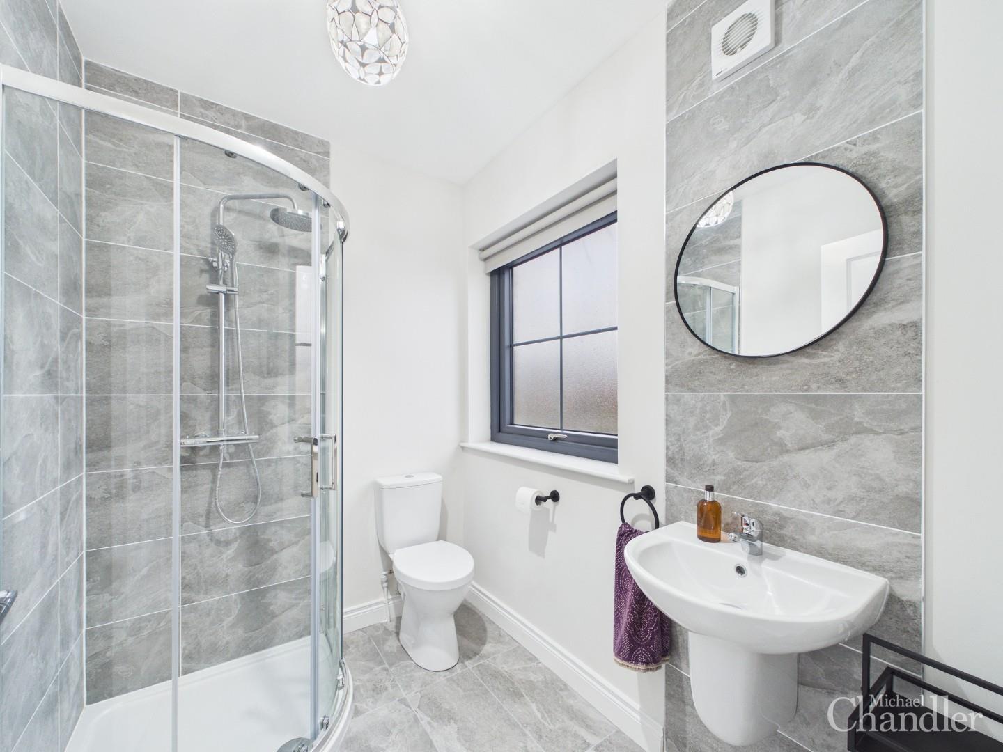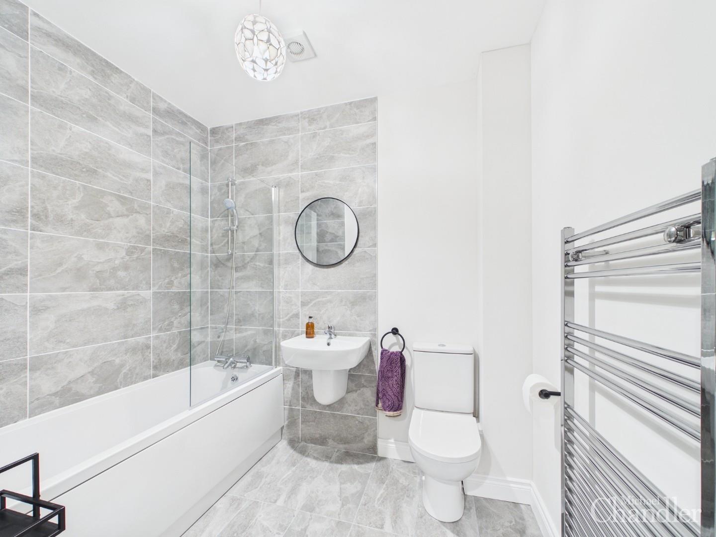 The apartment comprises two generously sized bedrooms, with the principal bedroom benefiting from an ensuite shower room, providing both comfort and privacy. The main bathroom is finished to a high standard, showcasing a contemporary three-piece white suite complemented by stylish feature tiling.
