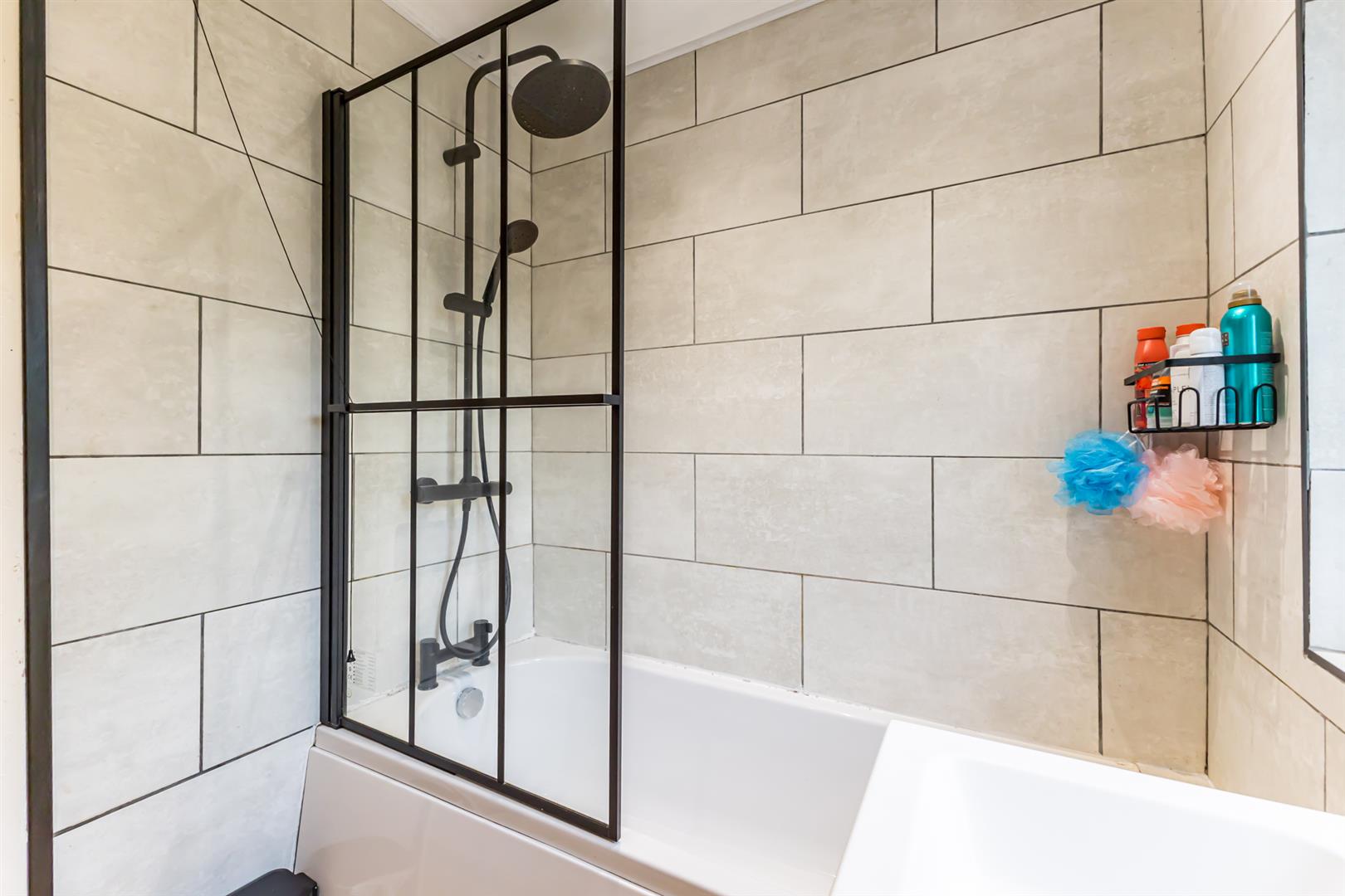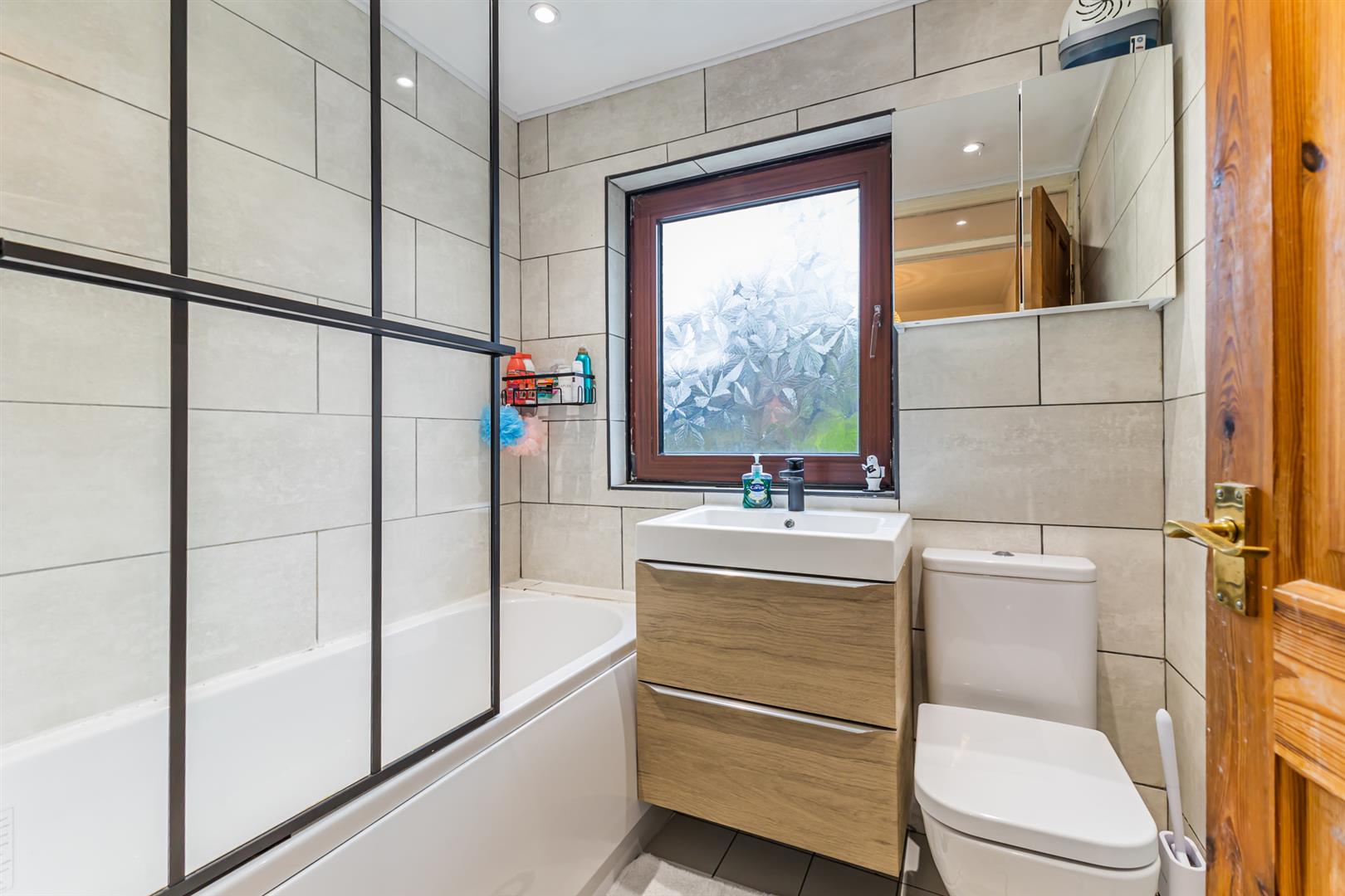 Porcelain tiled flooring, fully tiled walls, outlook to rear, spotlights, bath with glass shower screen, mixer tap and thermostatically controlled handheld shower and overhead drencher, floating vanity unit with drawers for storage, sink and mixer tap, low flush WC
