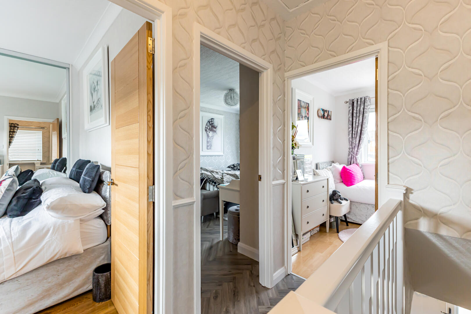 Carpet to stairs / Parquet wood laminate flooring to landing, access to roof space, outlook to side.