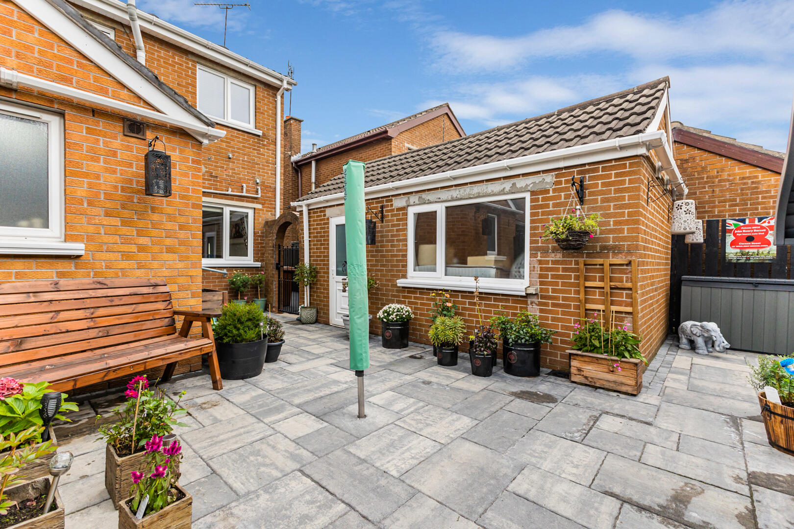 Fully enclosed paved courtyard to front, gate access to tarmac driveway providing ample off streetcar parking and leading to detached garage. To the rear a fully enclosed low maintenance space with paving ideal for outdoor entertaining, young children and pets alike. Beautiful, raised flowerbed with shrubs adding colour to the space. Gate access to driveway. Outside water, outside light