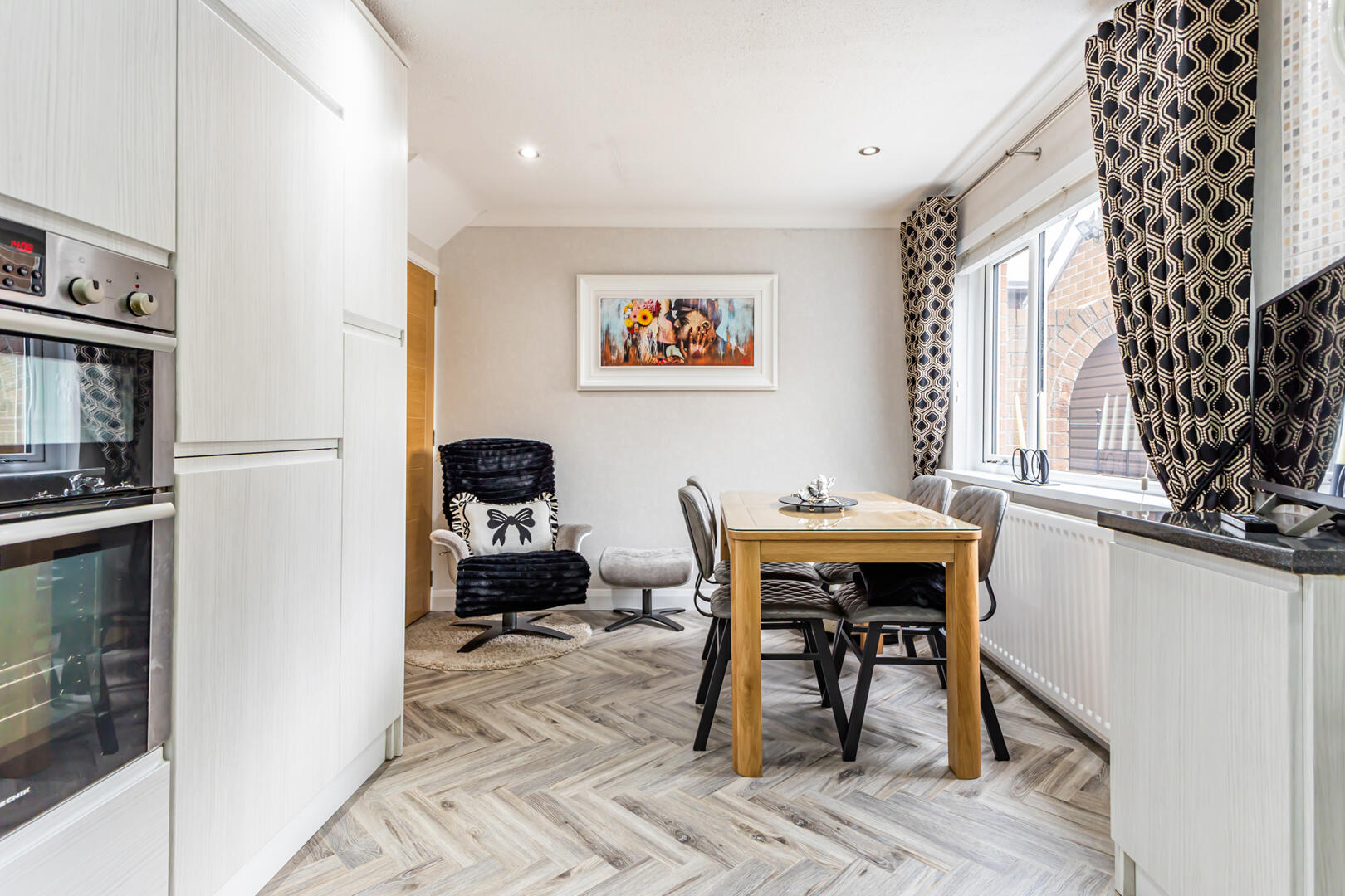 Parquet laminate wood flooring, recessed spot lighting, uPVC door to rear garden with double glazed frosted inset.
