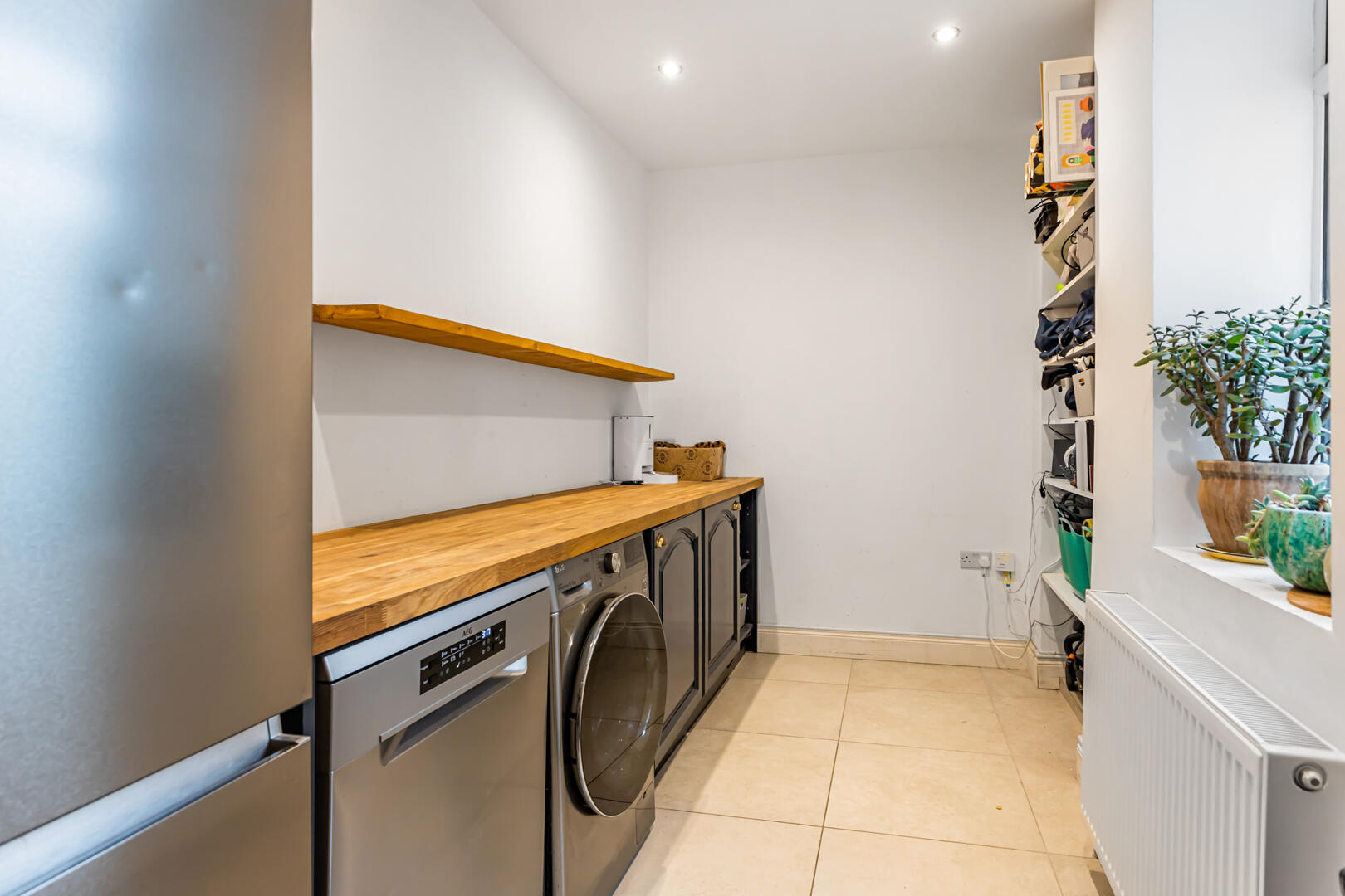 Outlook to rear garden, recessed spotlighting, solid wood low level units, solid wood worktop, shelves, space for fridge/freezer, plumbed for washer/dryer.