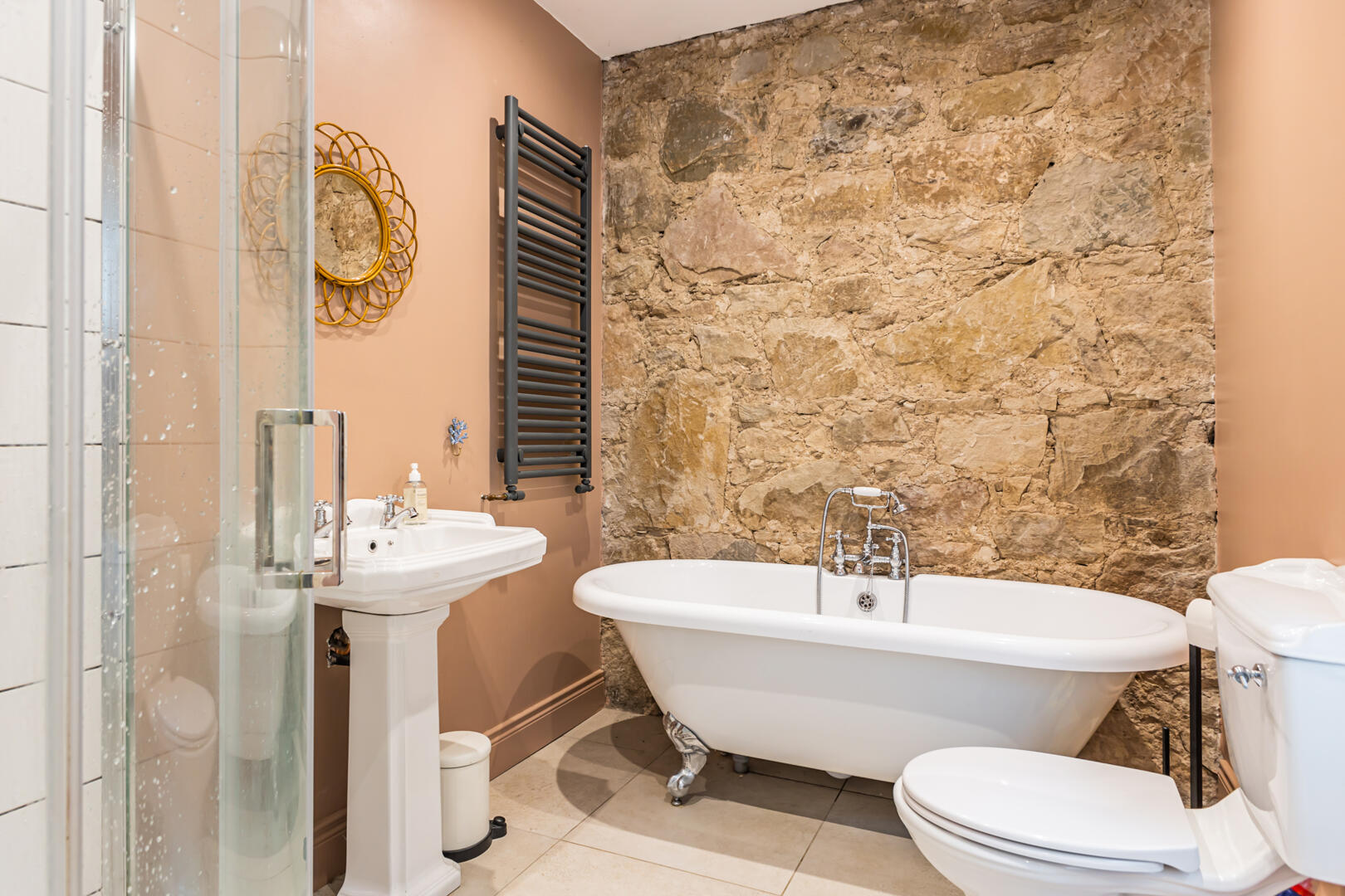 Outlook to rear, porcelain tiled floor, recessed spot lighting, exposed stone feature wall, freestanding bath with chrome feet, chrome mixer tap & handheld attachment, pedestal sink & chrome mixer tap, low flush WC, shower enclosure with thermostat handheld and overhead shower, tiled walls only in shower enclosure, heated towel rail, extractor fan.