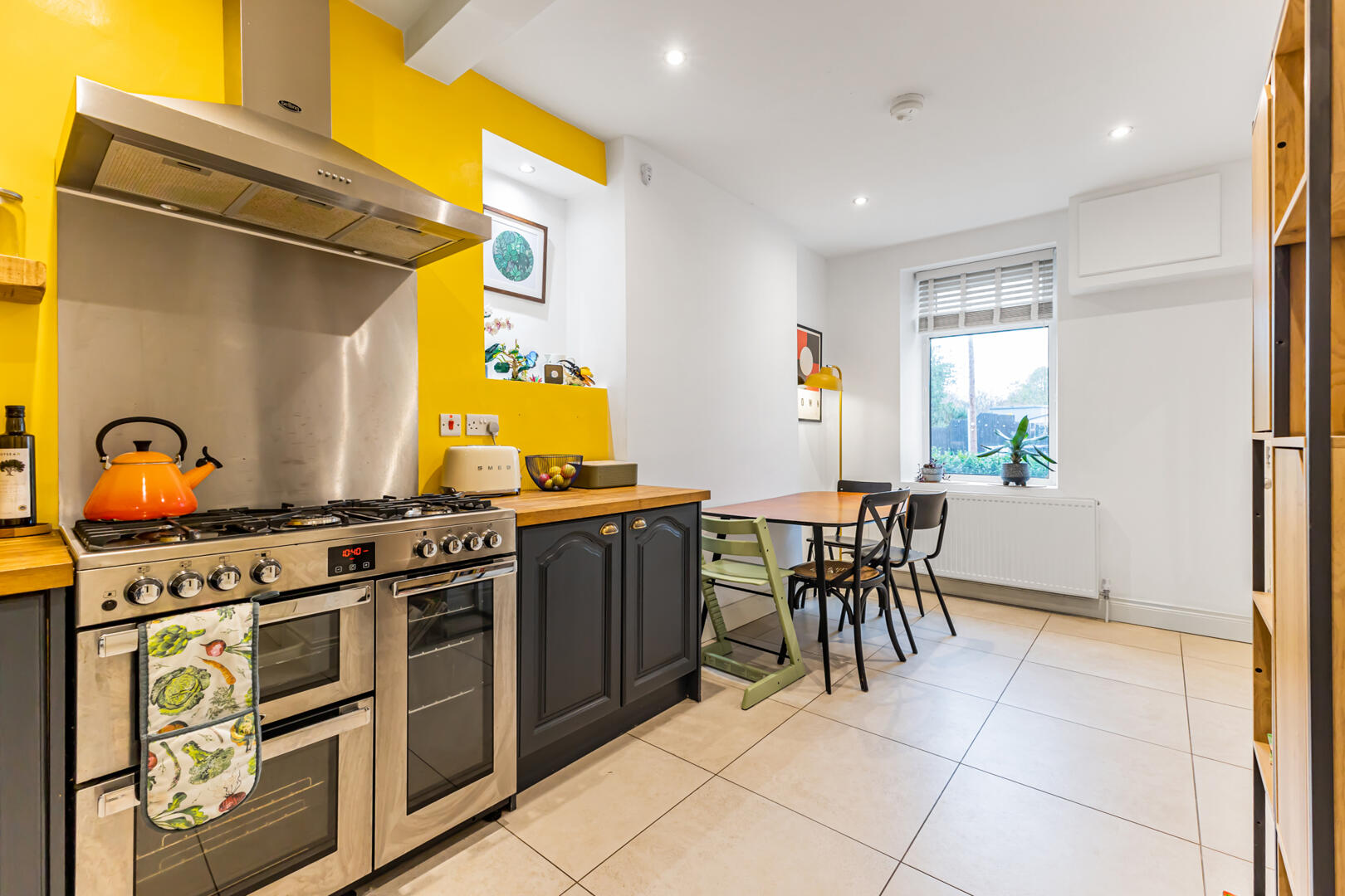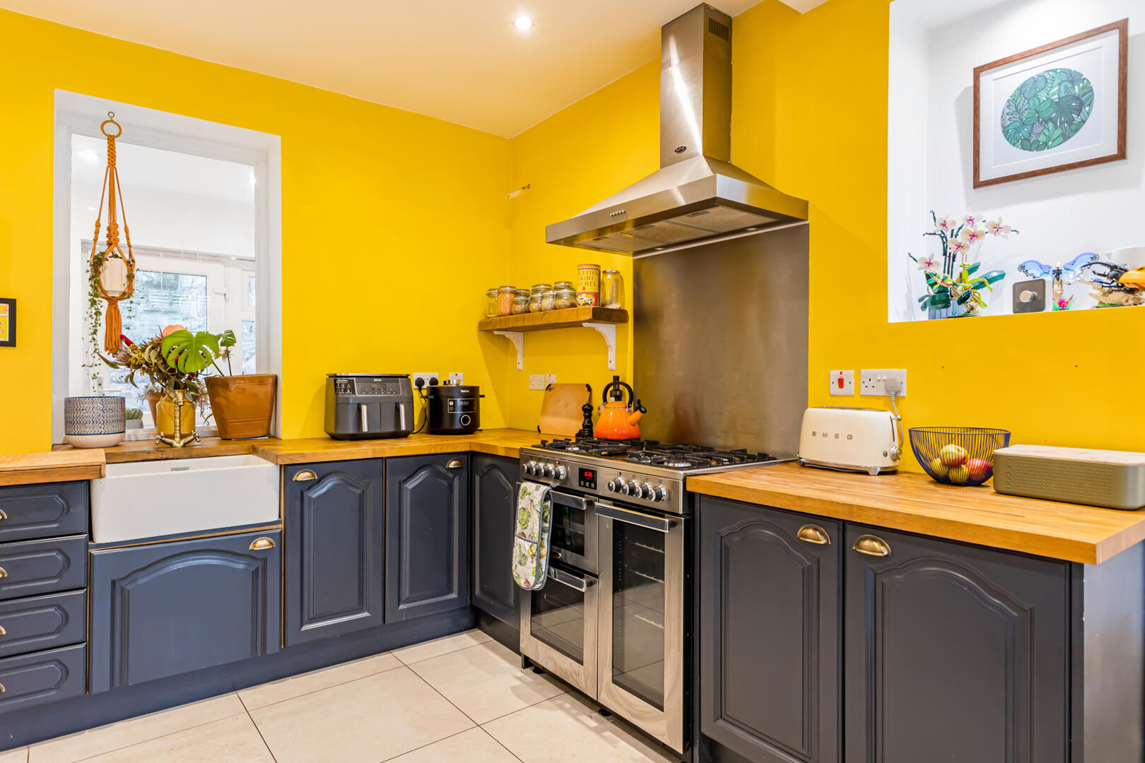 Dual aspect outlook to front and rear, porcelain tiled floor, recessed spotlighting, ample dining area, solid wood low level units, bespoke solid wood work surface, space for Range cooker, extractor fan, Belfast sink and an antique style tap, understairs storage.