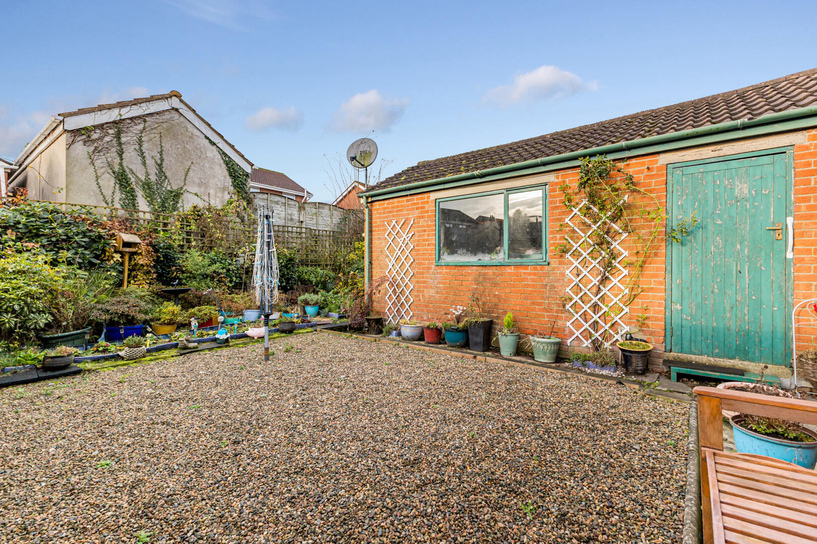 Externally, the home enjoys a tarmac driveway leading to the detached garage, a front lawn with mature planting, and an enclosed rear garden with paved patio area, ideal for outdoor entertaining or family living.