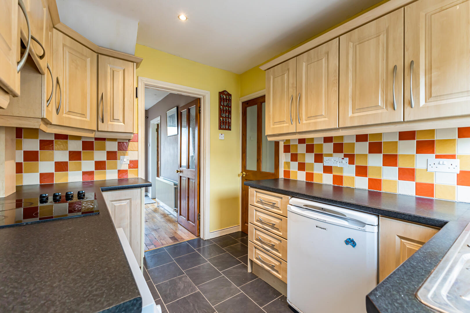 Outlook to rear, laminate wood floor, tiled splashback, recessed spotlights, range of low- and high-level units with laminate work surface, integrated Hotpoint electric oven / grill, four ring electric hob, extractor fan, space for dishwasher, space for fridge / freezer, single bowl sink with drainer and chrome mixer tap, uPVC door with glass inset to rear garden