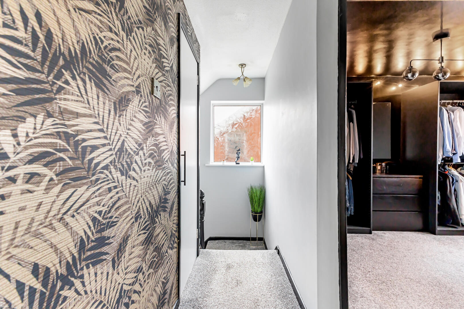 Carpet, outlook to side, access to hot press with water tank and shelving, access to roof space