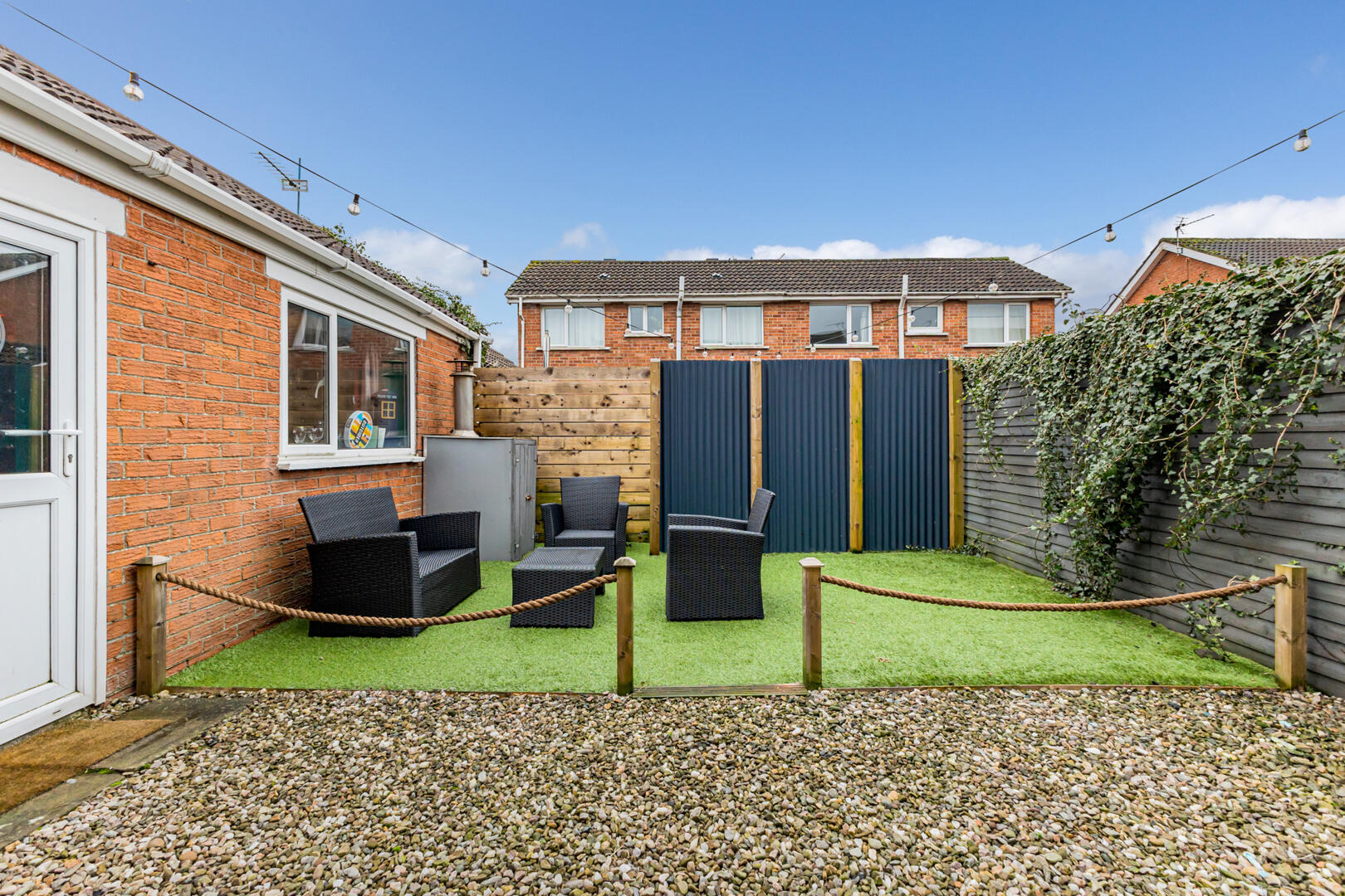 Fully enclosed front garden with tarmac driveway. Lawn with barked flowerbed edging. uPVC gutters, Fascia and downspouts. To the rear a fully enclosed private easily maintained space with both decorative pebbled patio area and artificial grass perfect for outdoor entertaining, young children and pets alike, oil tank, boiler, outside water, outside light