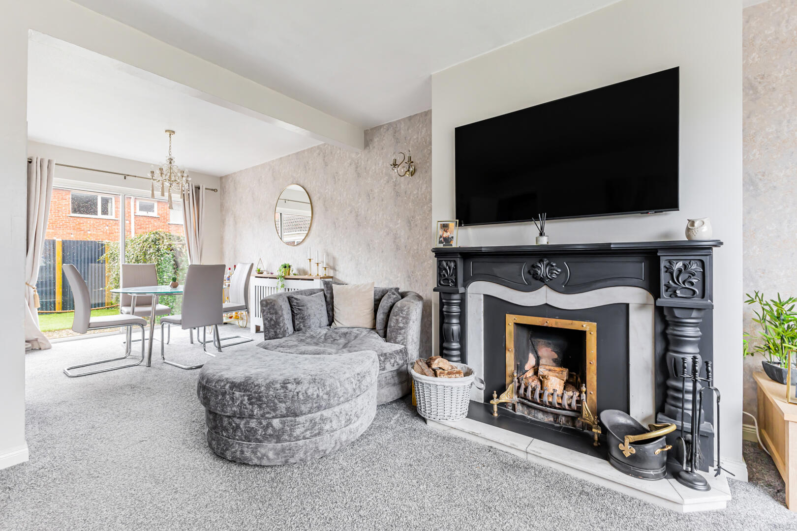 Carpet, outlook to front, wall lights, feature open fire with wooden surround, slate and granite hearth with cast iron inset, Dining room with uPVC sliding patio doors to rear garden.