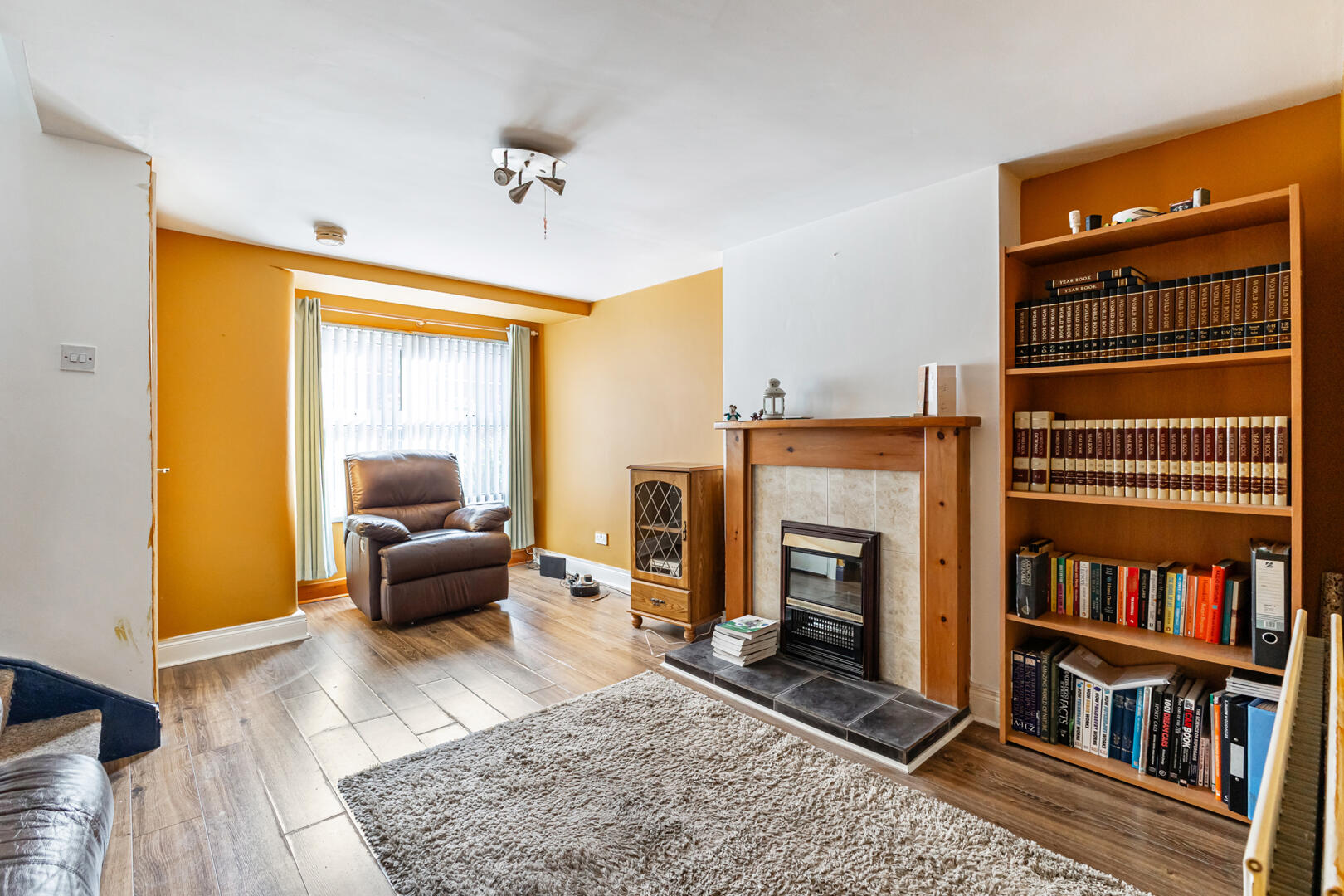 Outlook to the front, laminate wood flooring, feature electric fireplace with wooden surround and tiled hearth