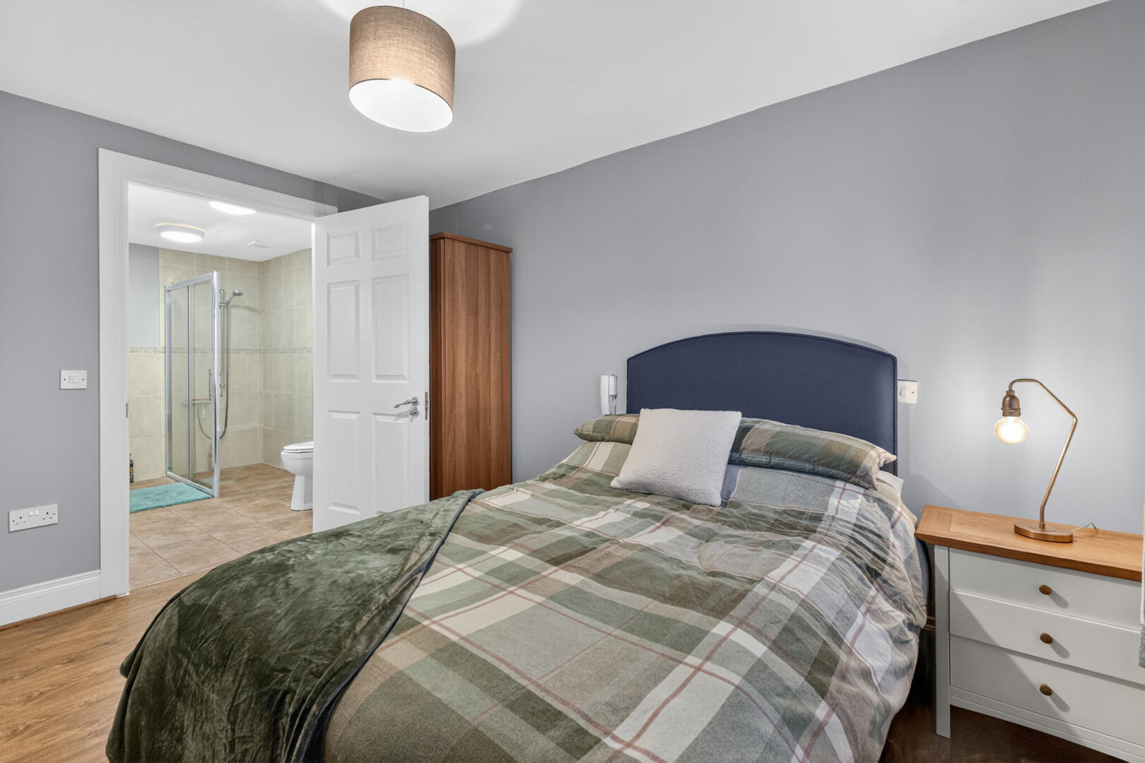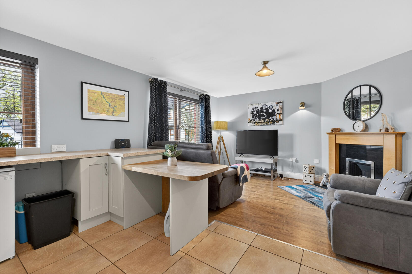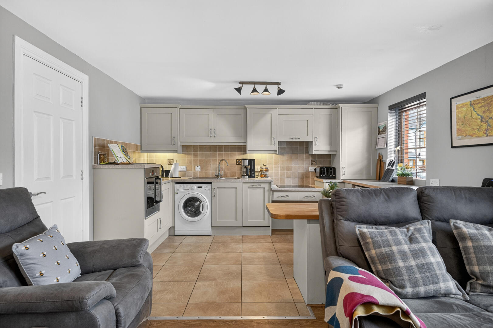 Internally, the property offers modern and comfortable living with two well-proportioned bedrooms, a Jack-and-Jill accessible bathroom, and additional storage for added convenience. The open-plan kitchen and living area forms the heart of the home, featuring a shaker-style kitchen with integrated appliances, which flows seamlessly into a spacious lounge complete with a gas fire, creating a warm and inviting atmosphere.