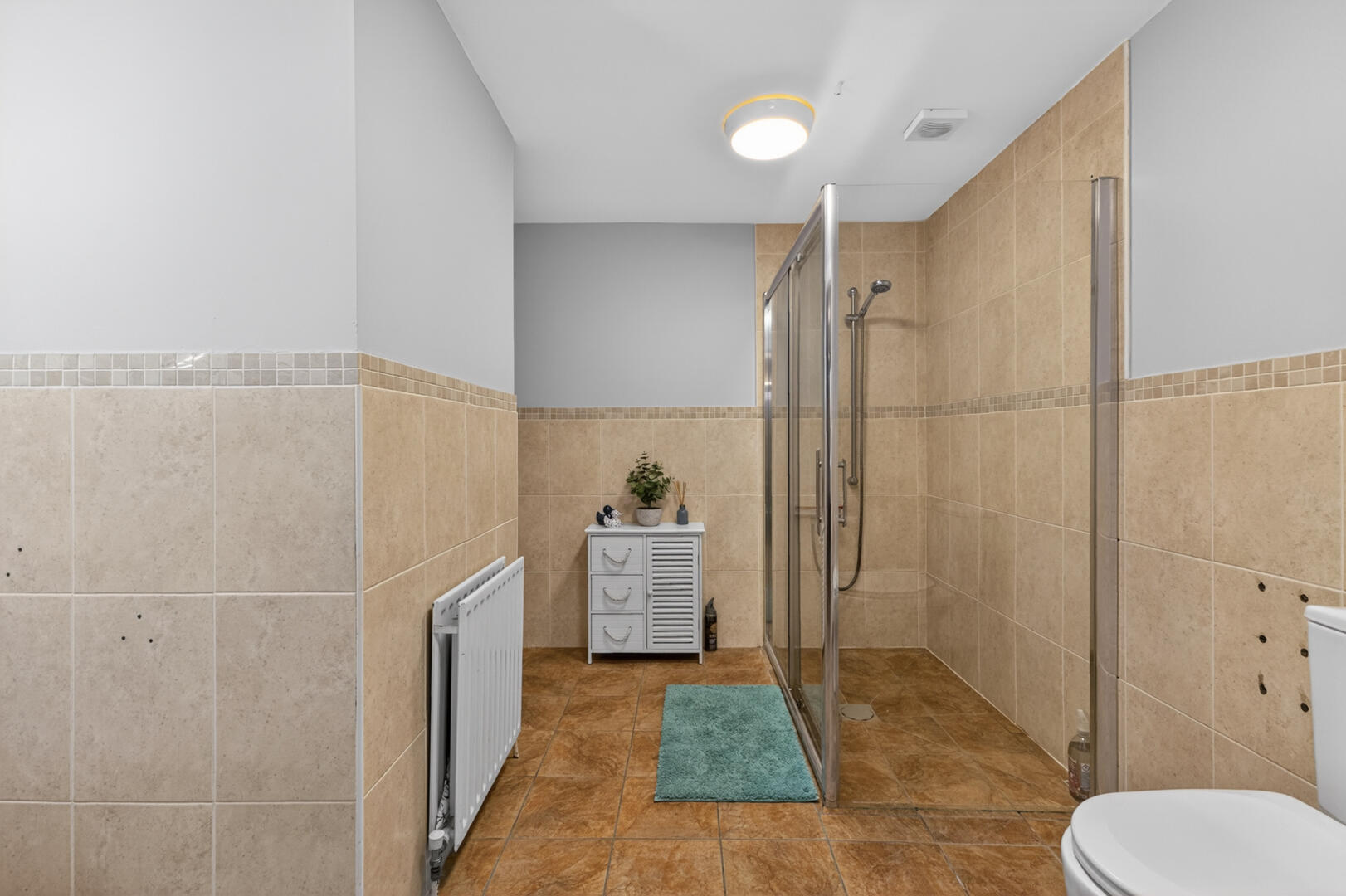 Ceramic tiled floor, recessed LED spotlighting, linen press with pressurised water cylinder and built-in shelving, excellent storage.