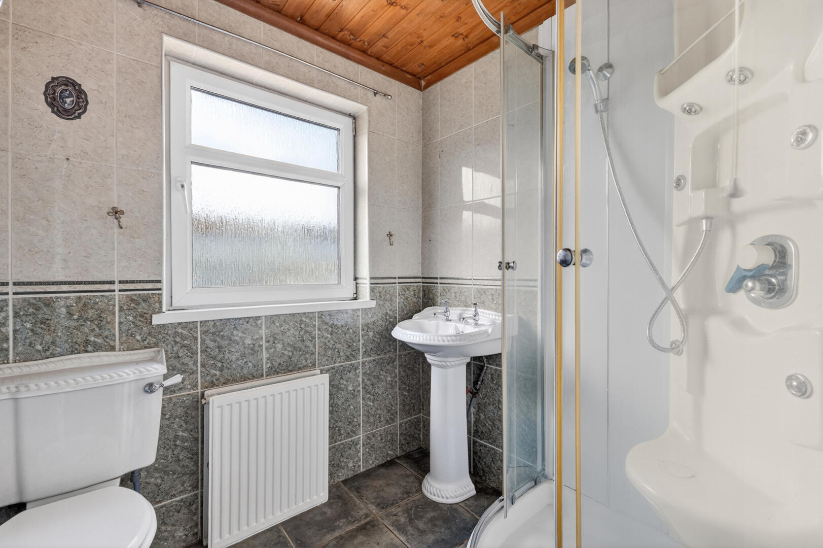 Outlook to rear, porcelain tiled floor, fully tiled walls, pedestal sink with chrome mixer tap, spotlights, low flush WC, shower enclosure with thermostatically controlled shower