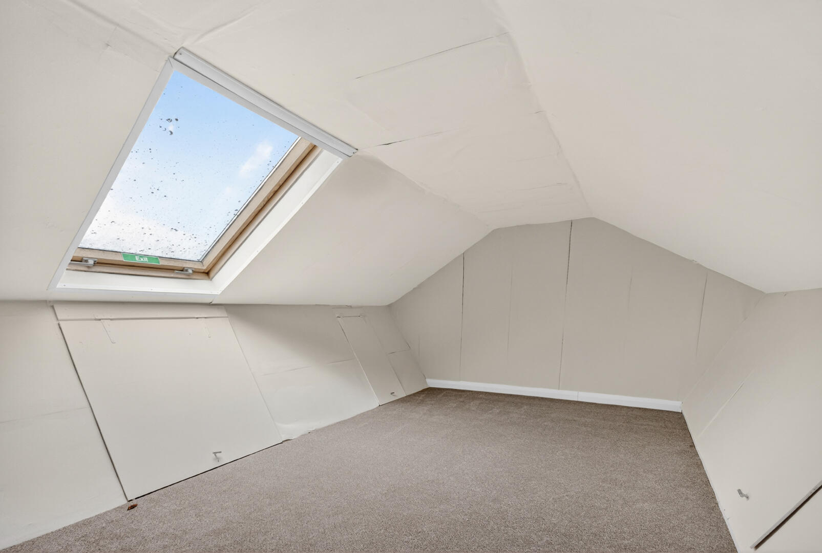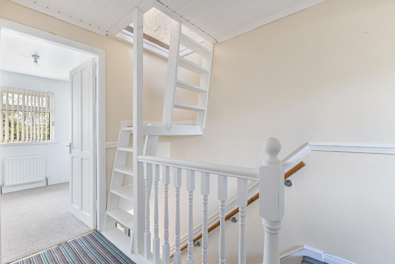 Carpet, wood panel ceiling, recessed spot lighting, access to linen press with water tank, access to floored attic with Velux window and excellent eave storage