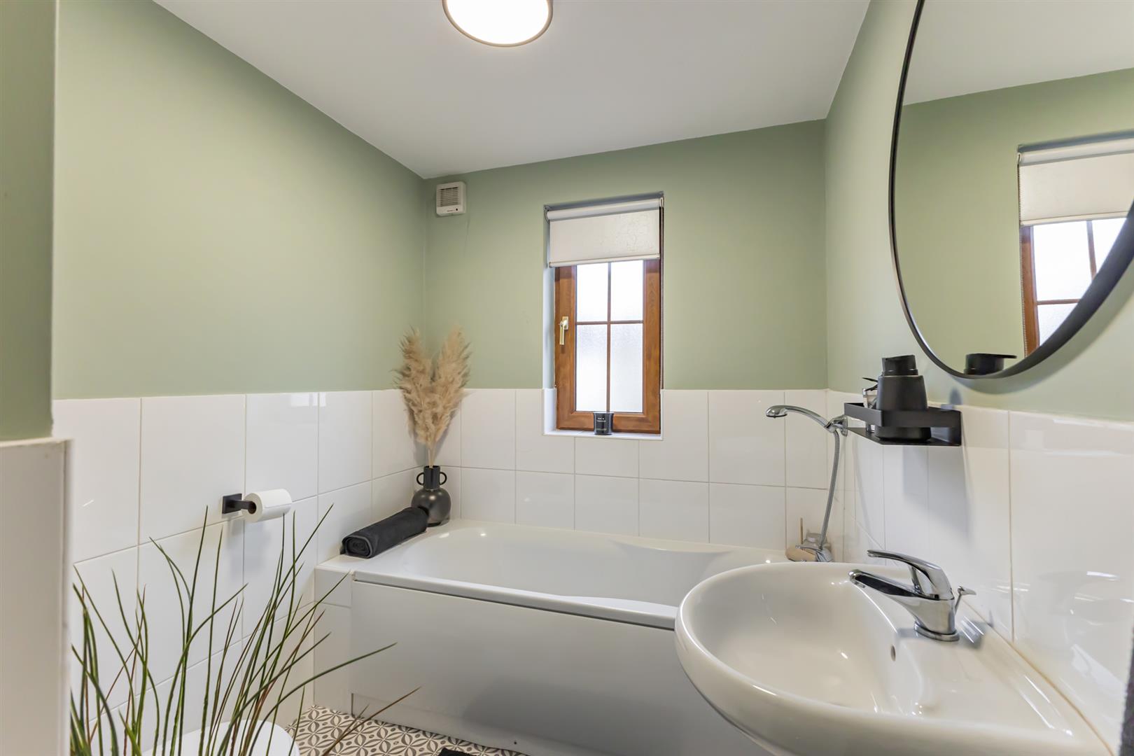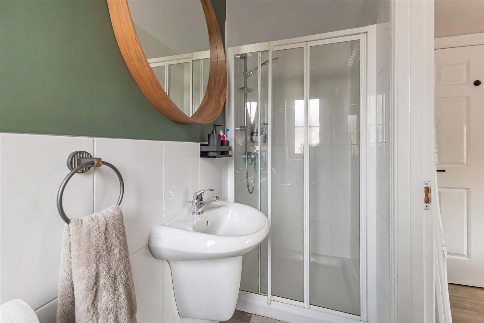 Laminate wood flooring, outlook to side, part tiled walls, low flush WC, ½ pedestal sink with chrome mixer tap, extractor fan, shower enclosure with thermostatically controlled shower