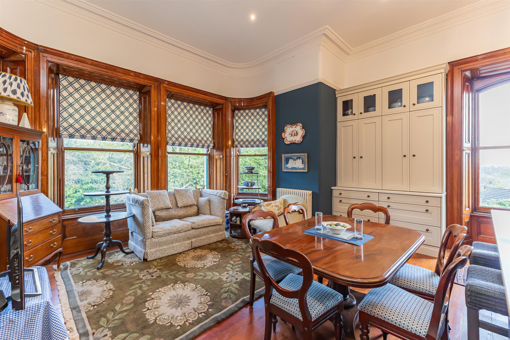 High cornice ceilings, wall friezes, picture rail, fabulous dual aspect outlook to rear and side with working window shutters and original sliding sash windows, mature outlook to rear, fabulous outlook to side with views to Strangford Lough and the Ards Peninsula, pitch pine wooden flooring, ample dining and living space into rear bay, bespoke recently installed bespoke fitted kitchen by Johanna Montgomery, quartz work surface and upstand, integrated Neff four ring hob, fixed canopy extractor hood above, drawer units below, integrated Neff high level double ovens, built-in glazed display cabinets, deep filled pot and pan drawers, bespoke built-in double larder pantry with drawer units, contrasting materials, integrated fridge freezer, island unit, quartz work surface, inset ceramic sink unit, brass mixer taps, integrated dishwasher, refuse drawer, additional drawer units and cabinets to rear with corner casual dining/breakfast bar, access door to study, pelmet lighting above island unit, recessed LED spotlighting, Welsh style dresser, concealed display shelving, built-in wine rack, additional sockets, glazed display cupboards above and deep filled pot and pan drawers below with quartz surface, white marble period fireplace, cast iron and tiled inset and tiled hearth.