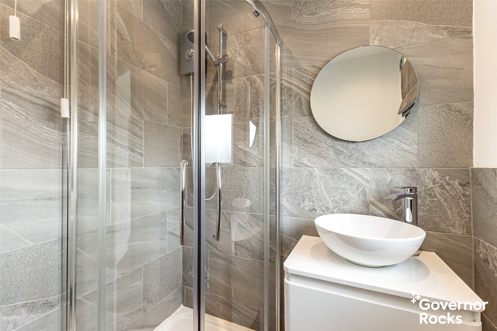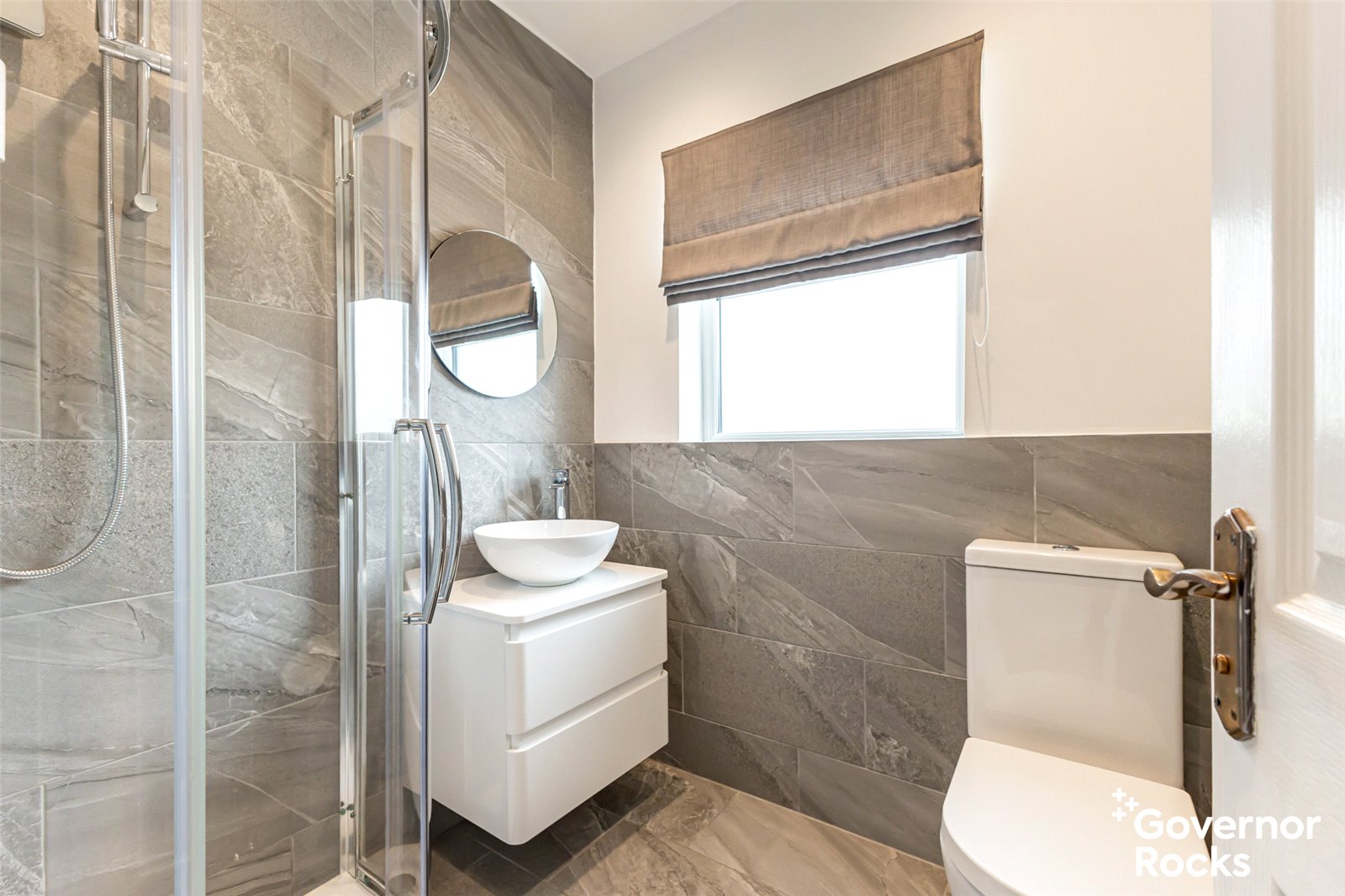 The sleek and contemporary shower room is equipped with a corner shower, WC, and wash-hand basin, offering a stylish and functional space.