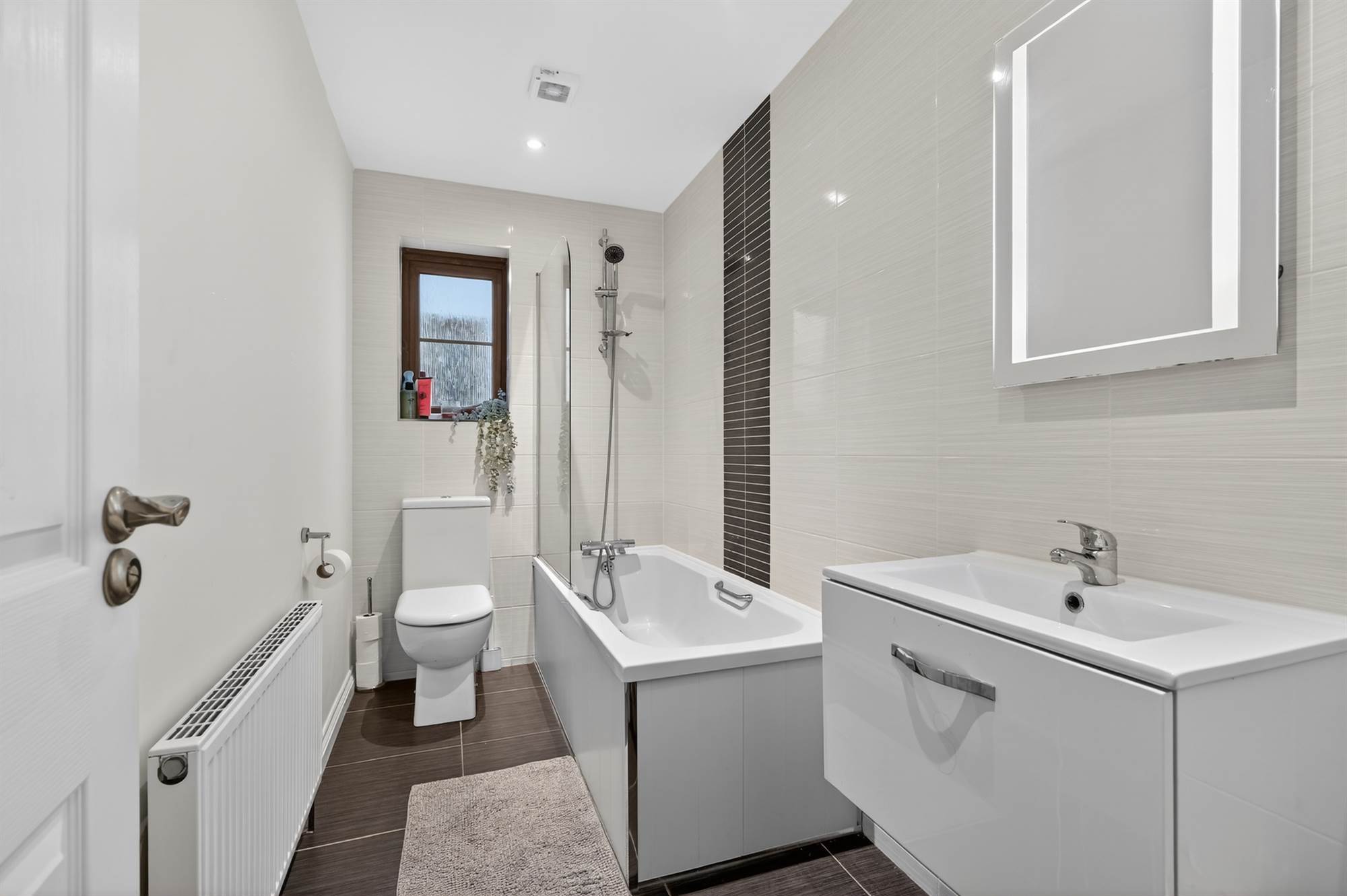 White bathroom suite comprising panelled bath with mixer tap and telephone hand shower, low flush wc, wash stand with drawer below. Ceramic tiled floor, fully tiled walls, LED lighting, extractor fan.