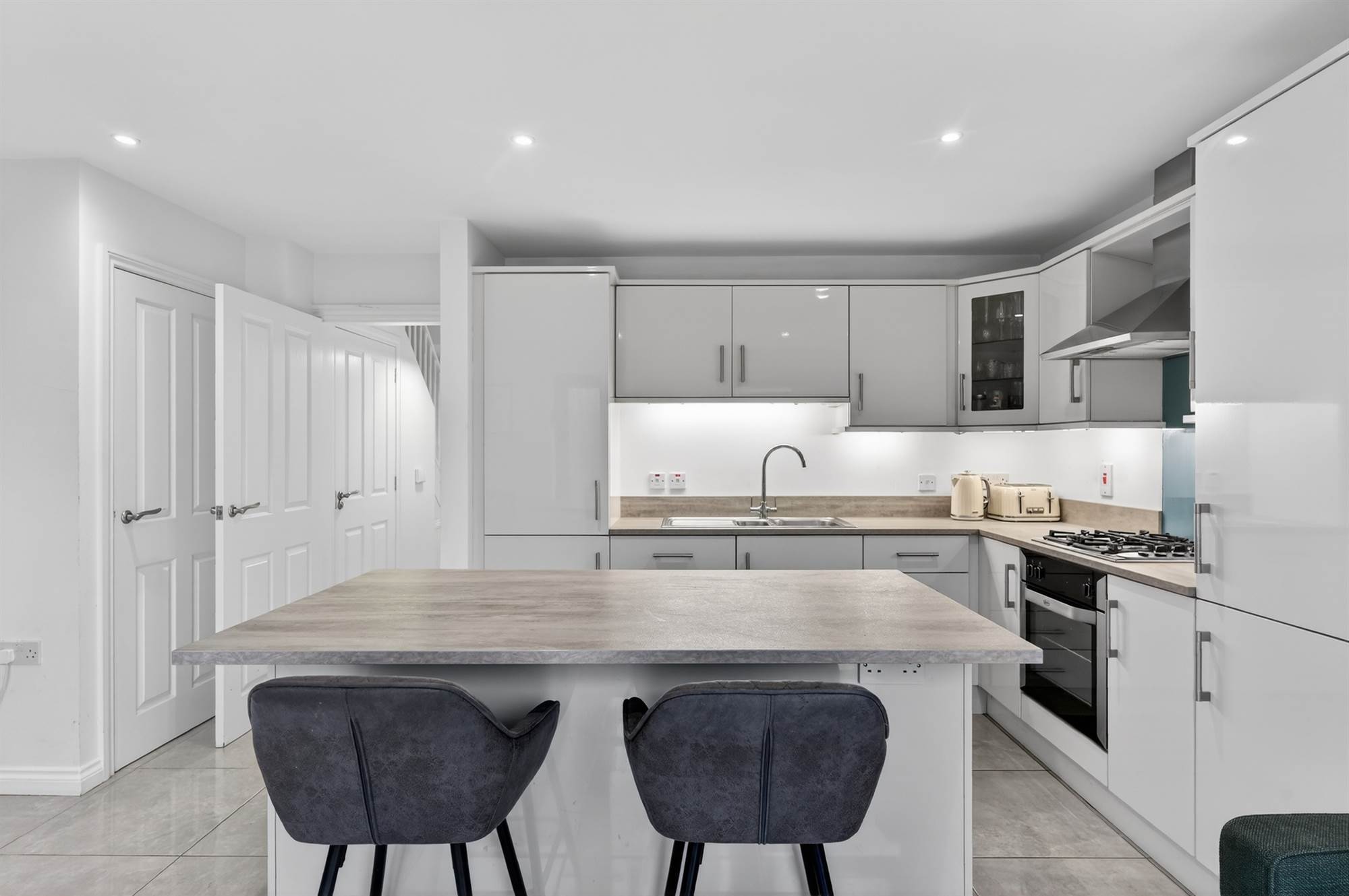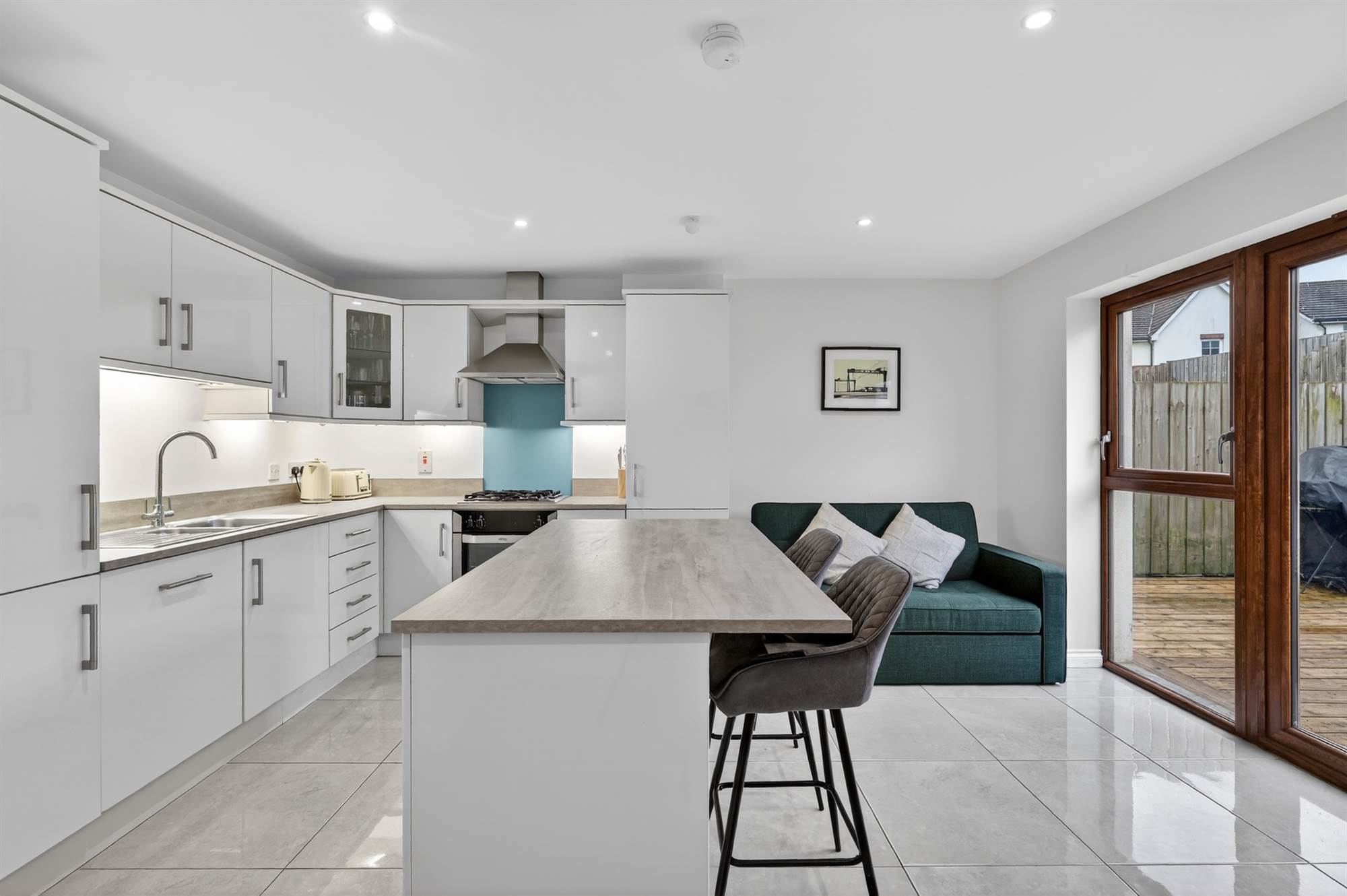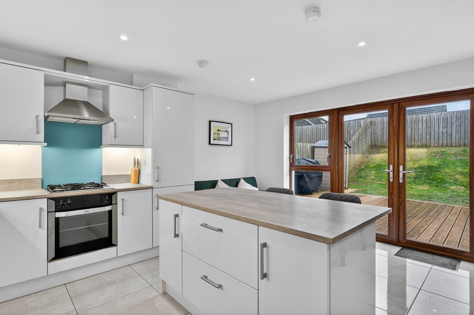 Contemporary high gloss Mussel kitchen with excellent range of high and low level units, limestone effect work surfaces. integrated fridge/freezer, dishwasher. One and a half bowl stainless steel sink unit with mixer taps, four ring gas hob and oven, extractor fan and canopy. Island with breakfast area, ceramic tiled floor. Ideal gas fired boiler. Casual dining area with LED lighting, double doors to patio/garden. Utility cupboard, plumbed for washing machine and space for tumble dryer.