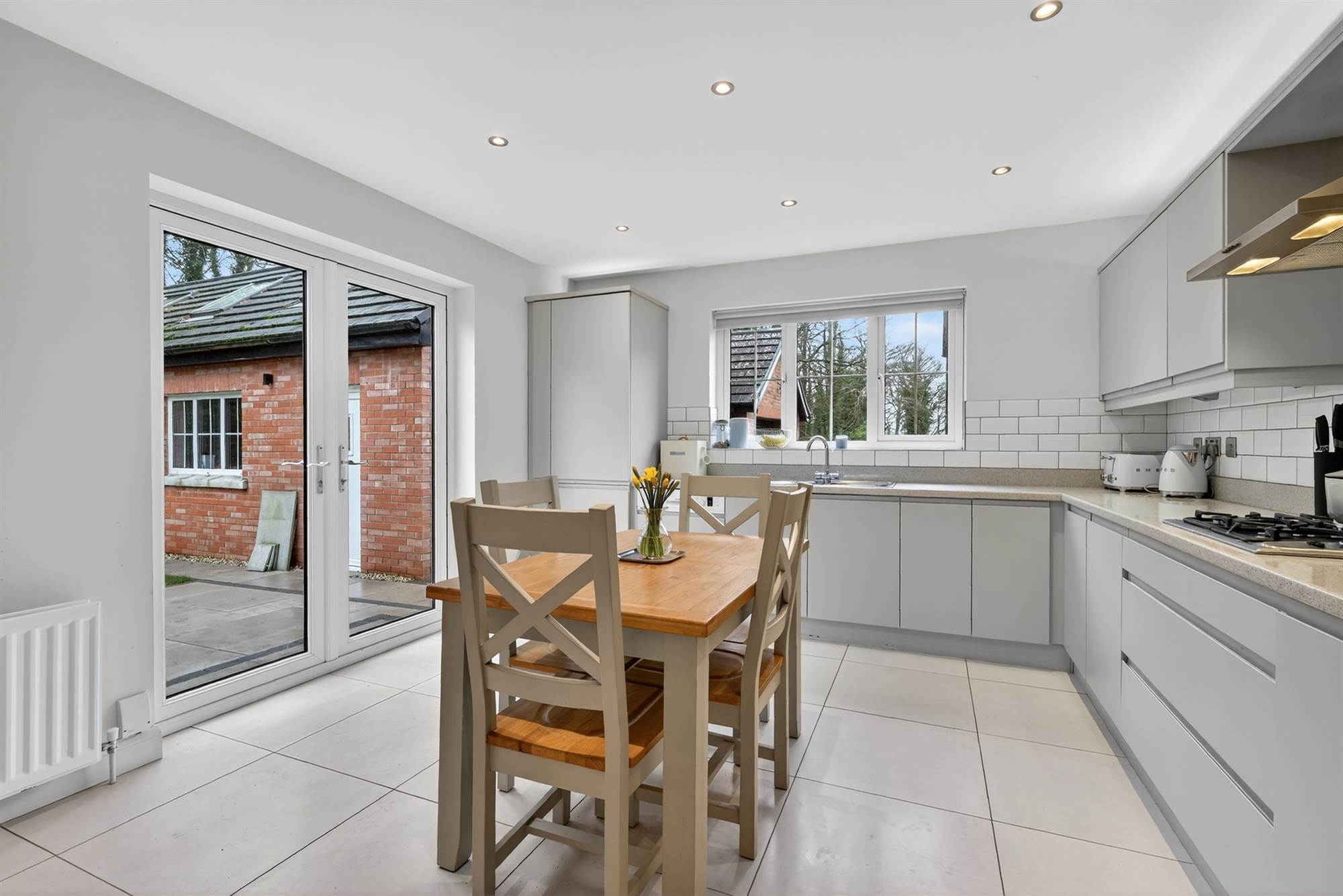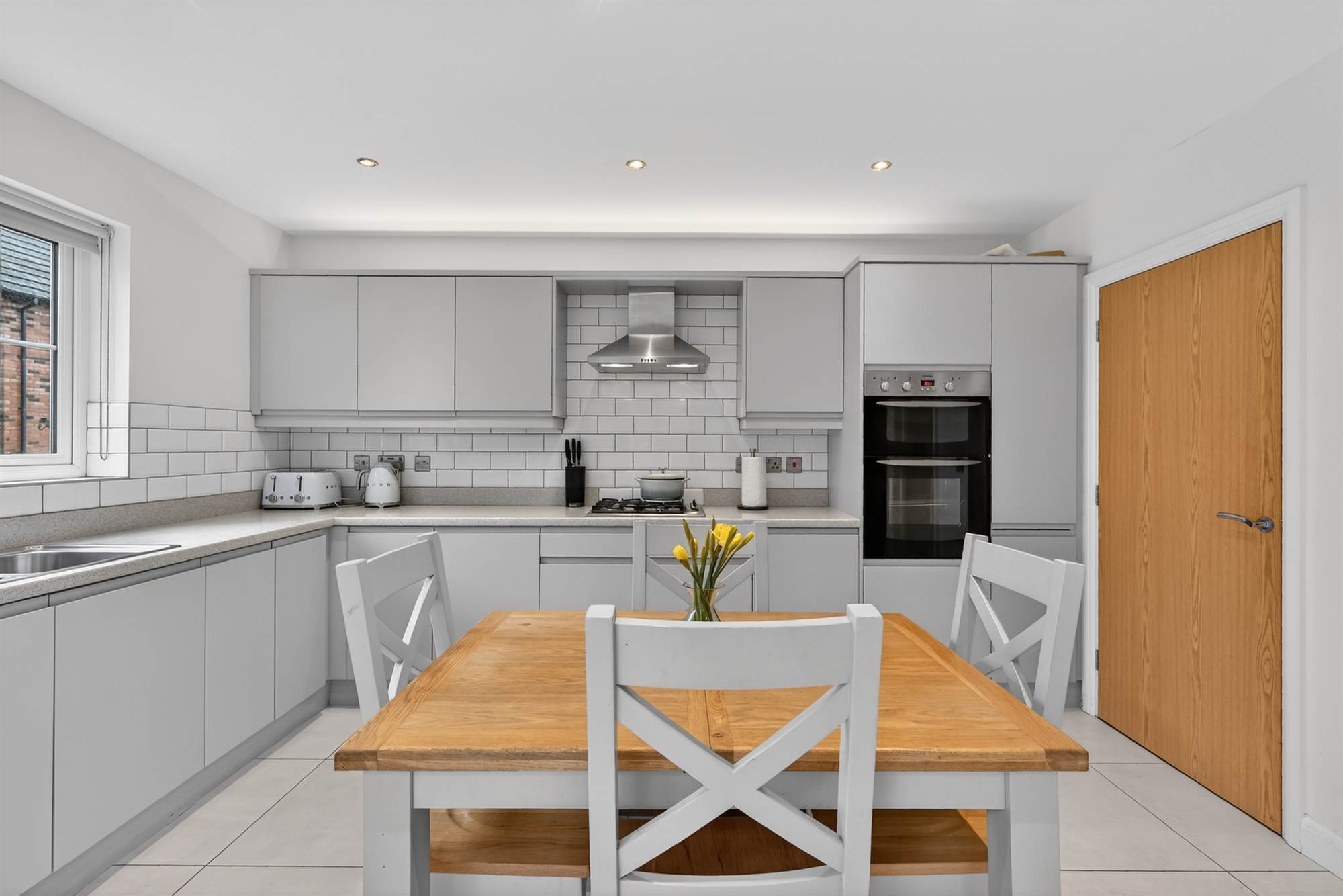Contemporary "Dove Grey" kitchen with excellent range of high and low level units, laminate work surfaces, 4 ring gas hob, double oven, 1.5 stainless steel sink unit with mixer tap, Bosch dishwasher, integrated fridge/freezer, ceramic tiled floor, casual dining area, double doors to outside.