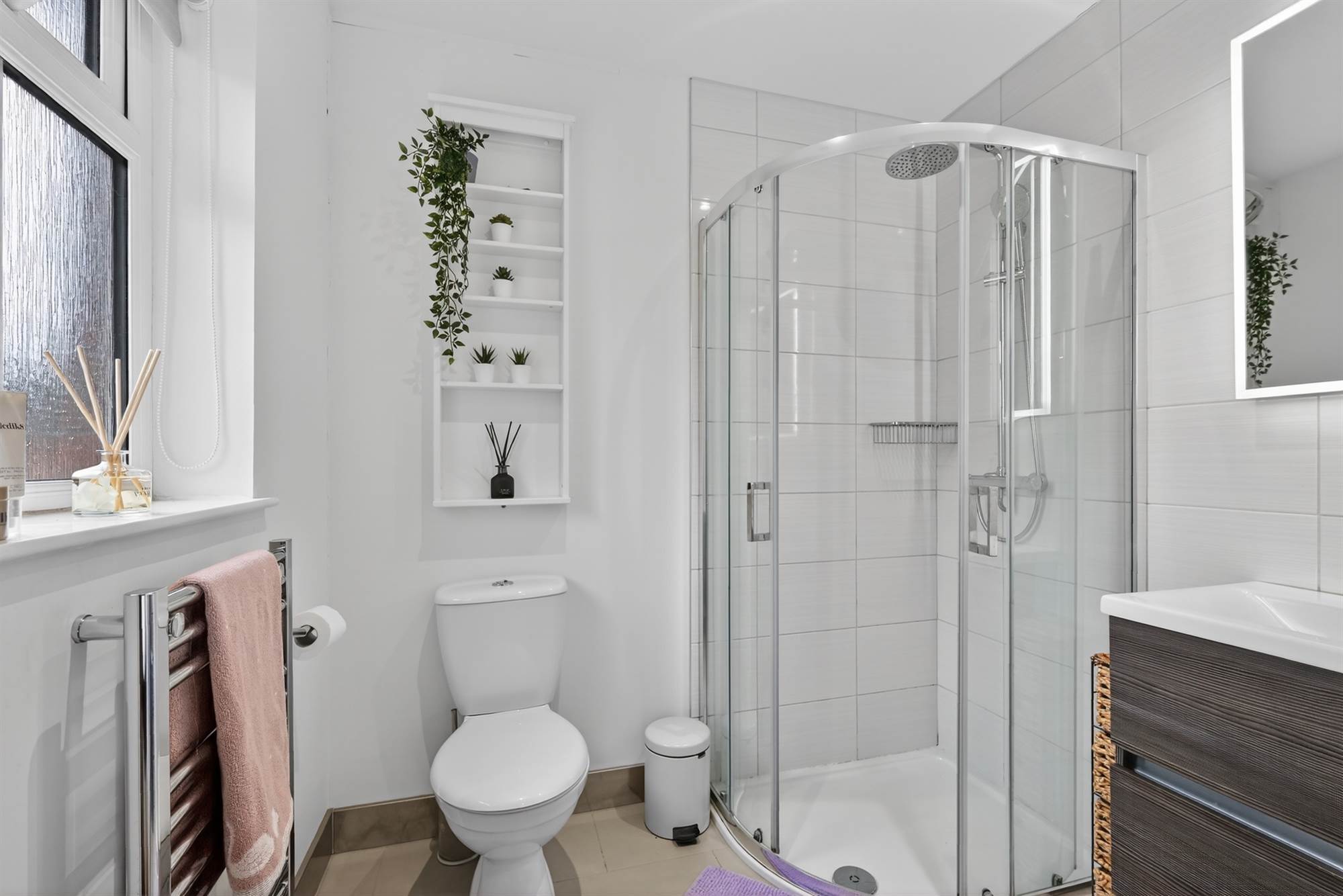 Fully tiled shower cubicle with thermostatic shower unit, rain shower head, vanity unit, low flush WC, heated towel rail, ceramic tiled floor, LED lighting, extractor fan.