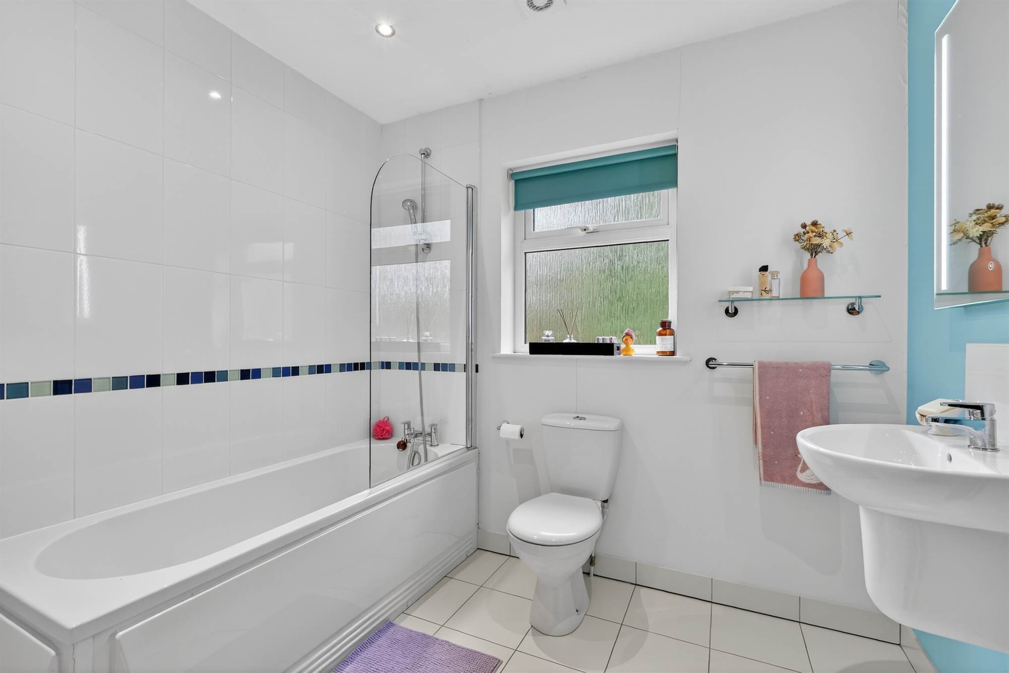 White bathroom suite comprising panelled bath with shower screen, thermostatic shower unit, low flush WC, wash hand basin, ceramic tiled floor, heated towel rail, extractor fan.