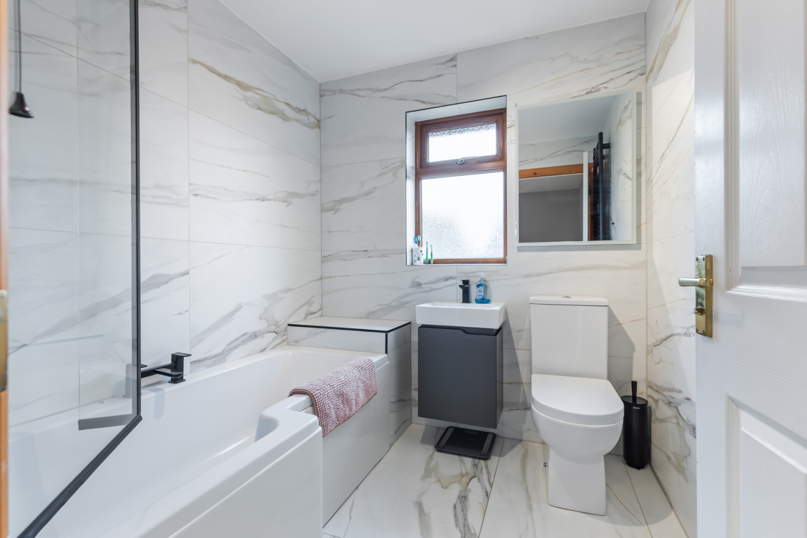 Modern white suite comprising: Panelled shower bath, black mixer aps, black thermostatically controlled shower with maching rain head and telephone hand shower, glass shower screen, modern floating vanity sink unit with black mixer taps, push button WC, feature fully tiled walls in marble tiling and matching floor, black towel radiator, wired for wall mounted mirror.