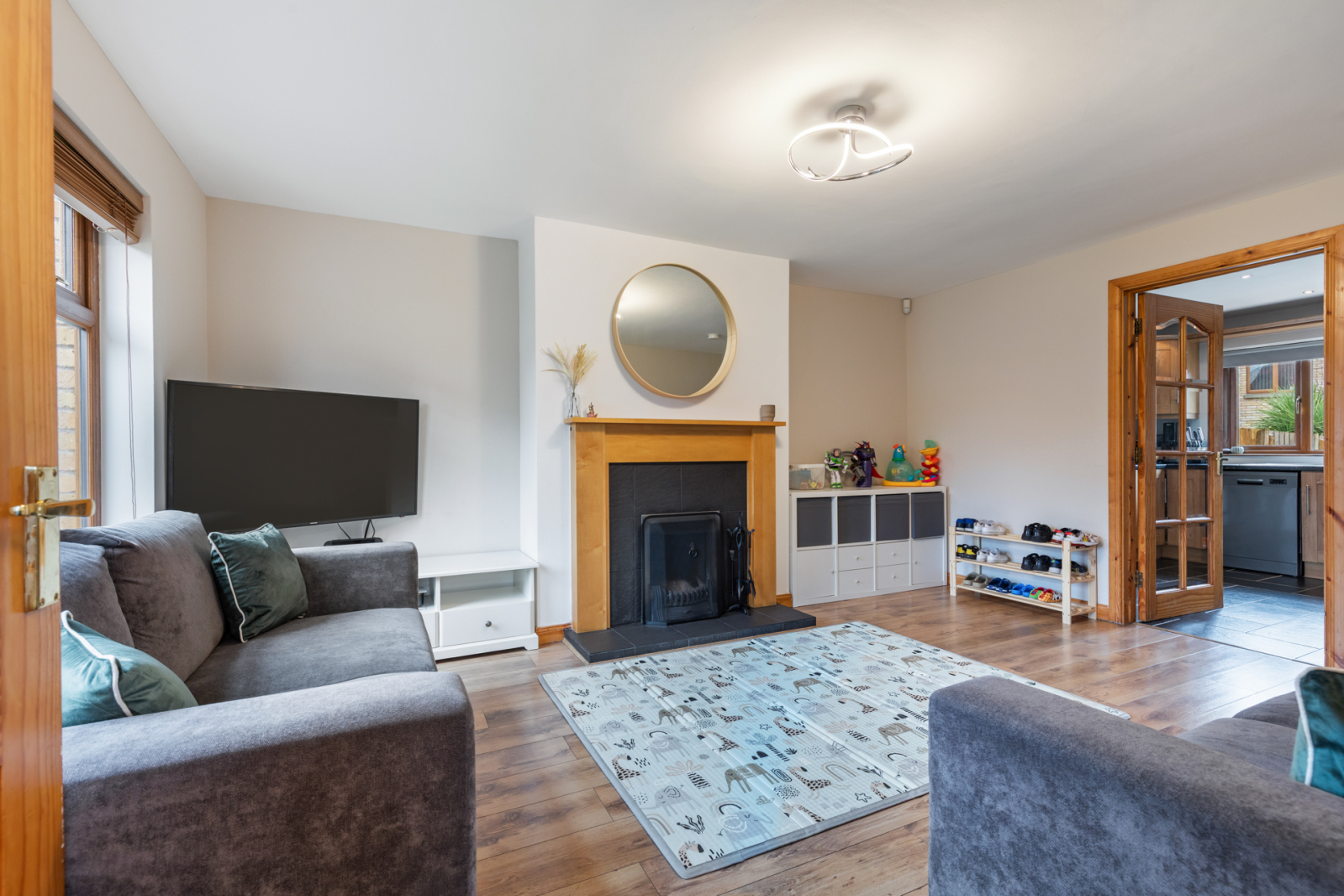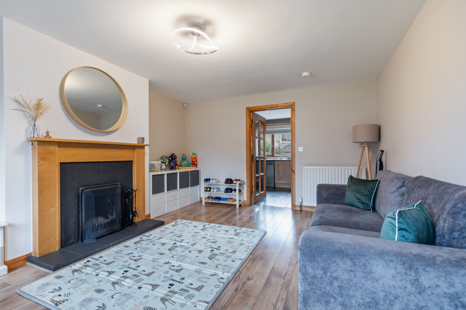 Attractive oak fireplace surround, ceramic tiled inset and hearth, open fire, TV point, polished laminate floor, glazed door to: