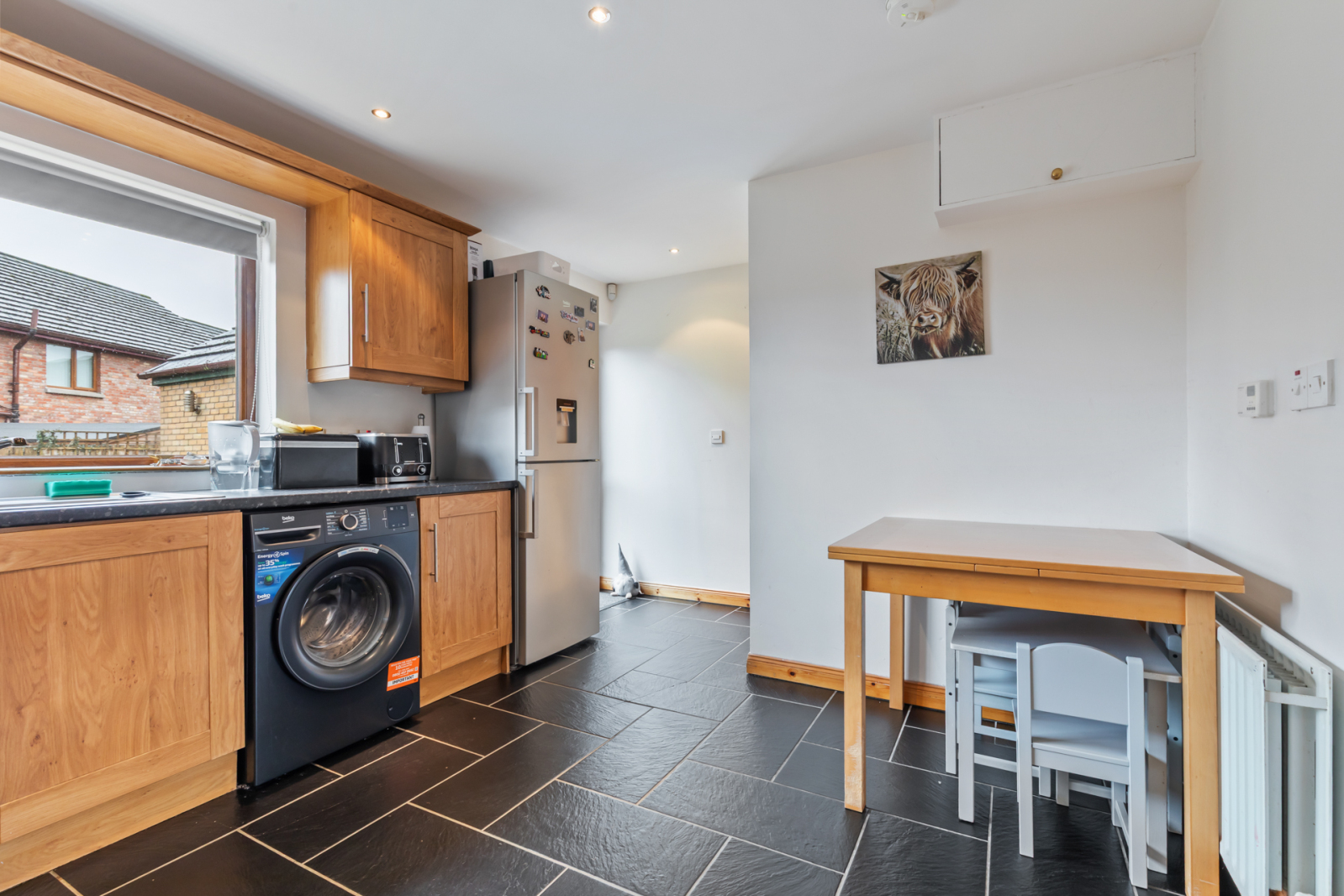 Single drainer stainless steel sink unit with mixer taps, range of high and low level oak effect shaker style units, granite effect Formica roll edge work surfaces, 4 ring ceramic hob unit, built in oven, stainless steel extractor hood and splashback, plumbed for dishwasher and washing machine, recessed spotlighting, ceramic tiled floor, uPVC double glazed door to rear.