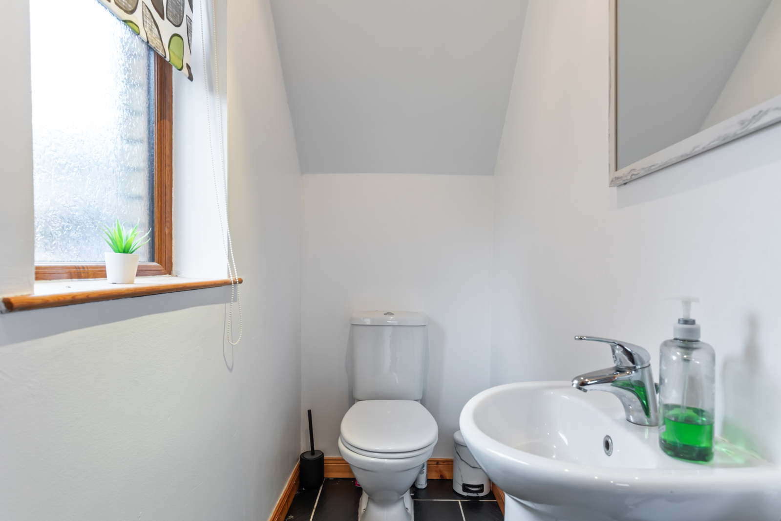 Modern white suite comprising: pedestal wash hand basin with mixer taps, push button WC, ceramic tiled floor, recessed spotlighting.