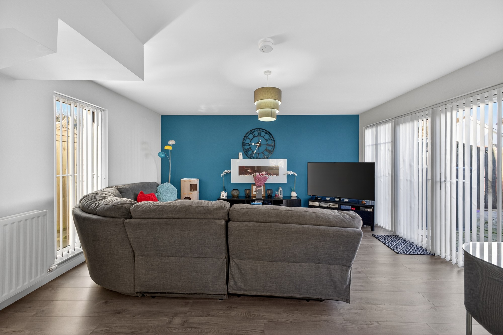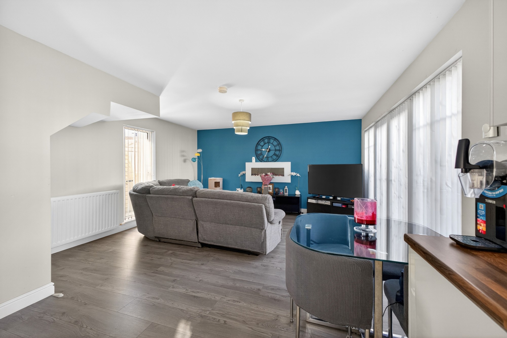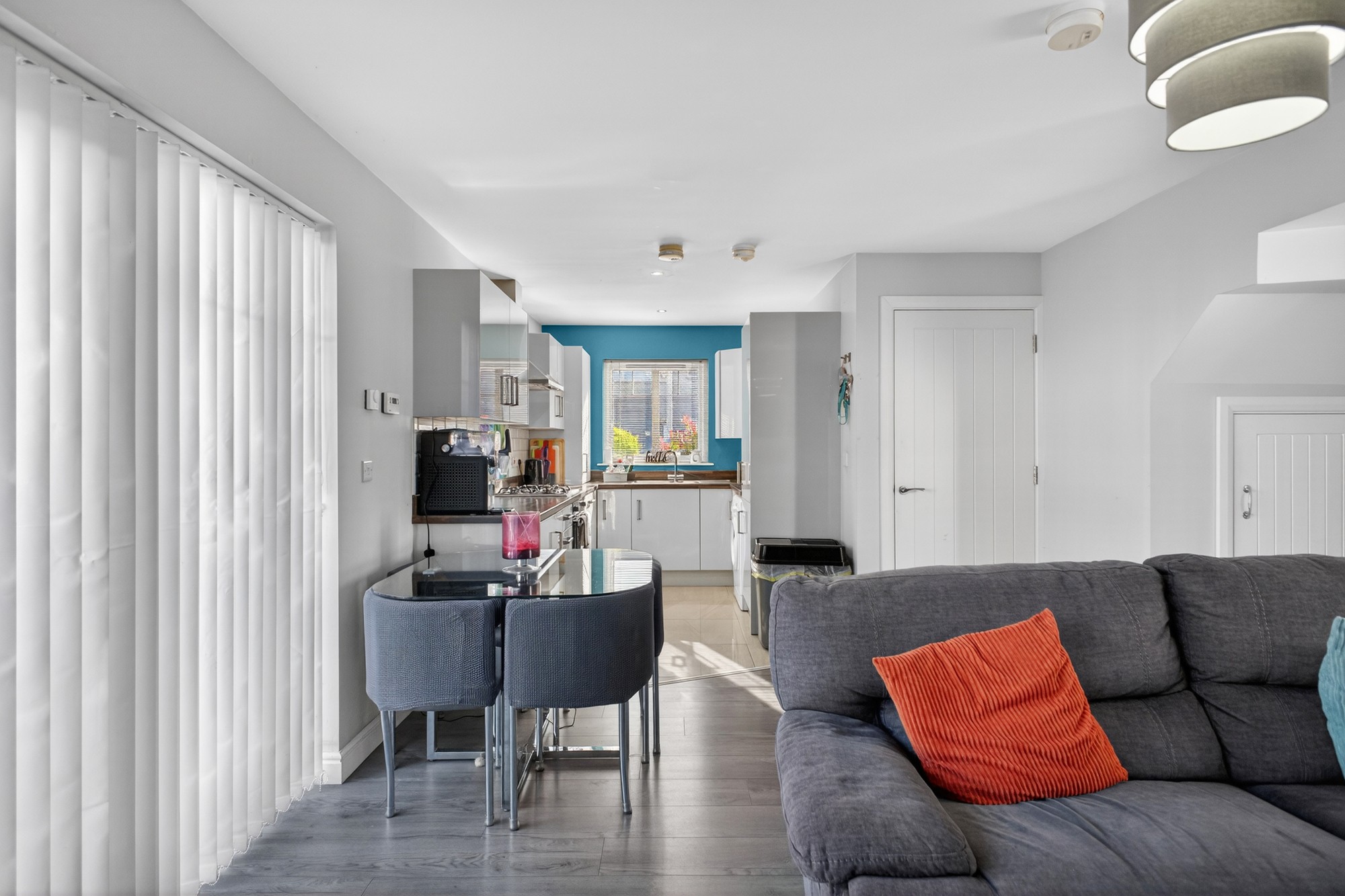 Superbly spacious living dining room opening into luxury fitted kitchen and with double pvc door access out to generous enclosed paved yard.