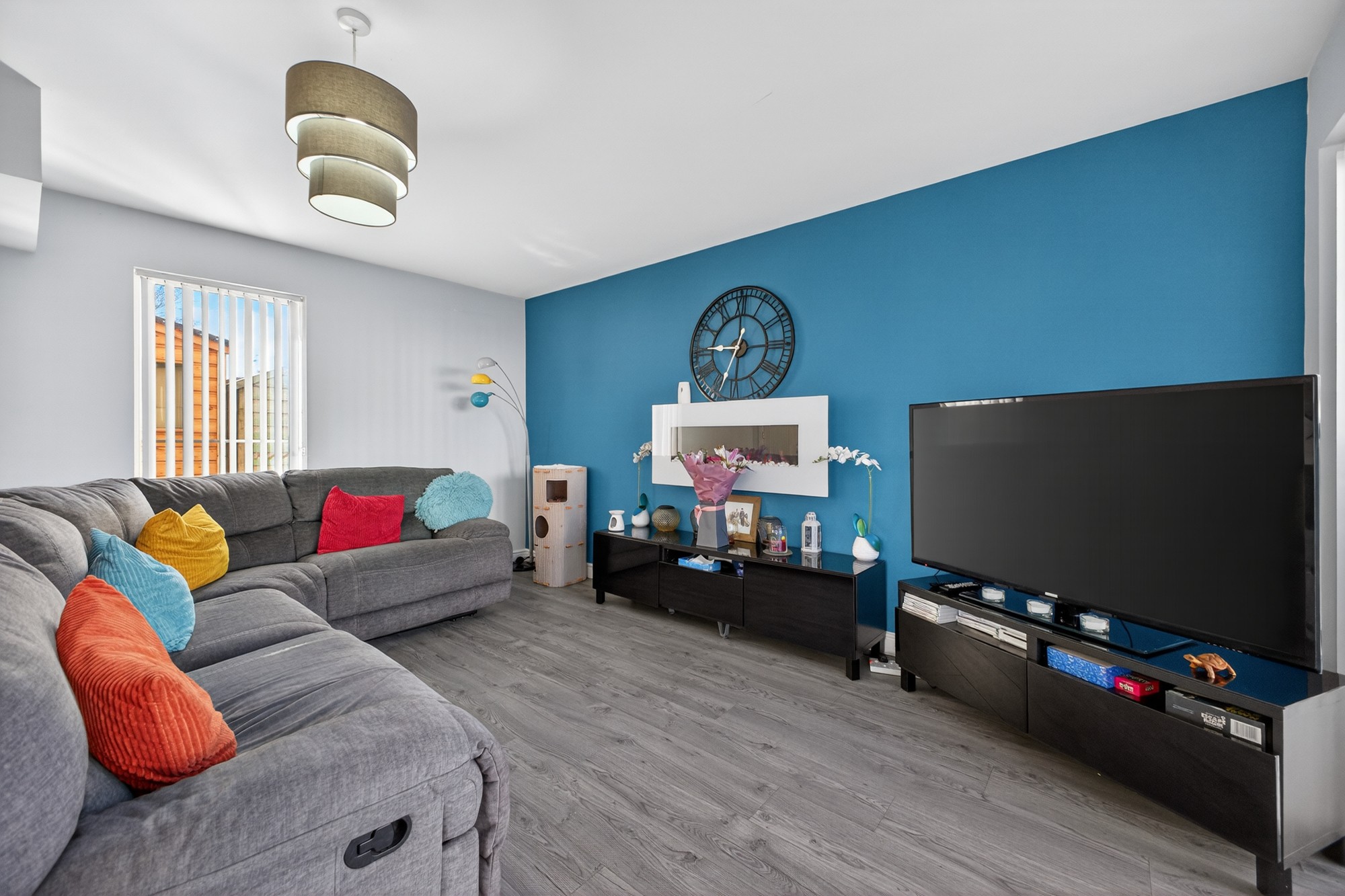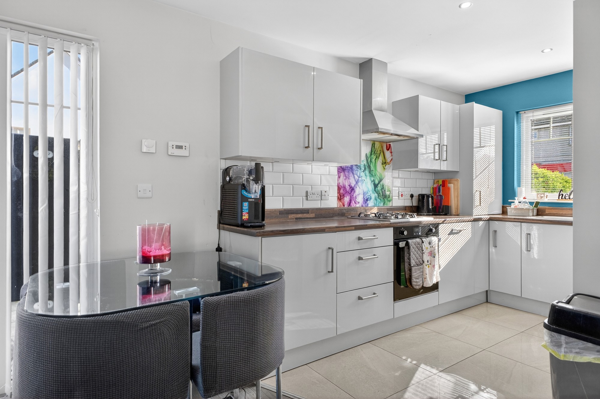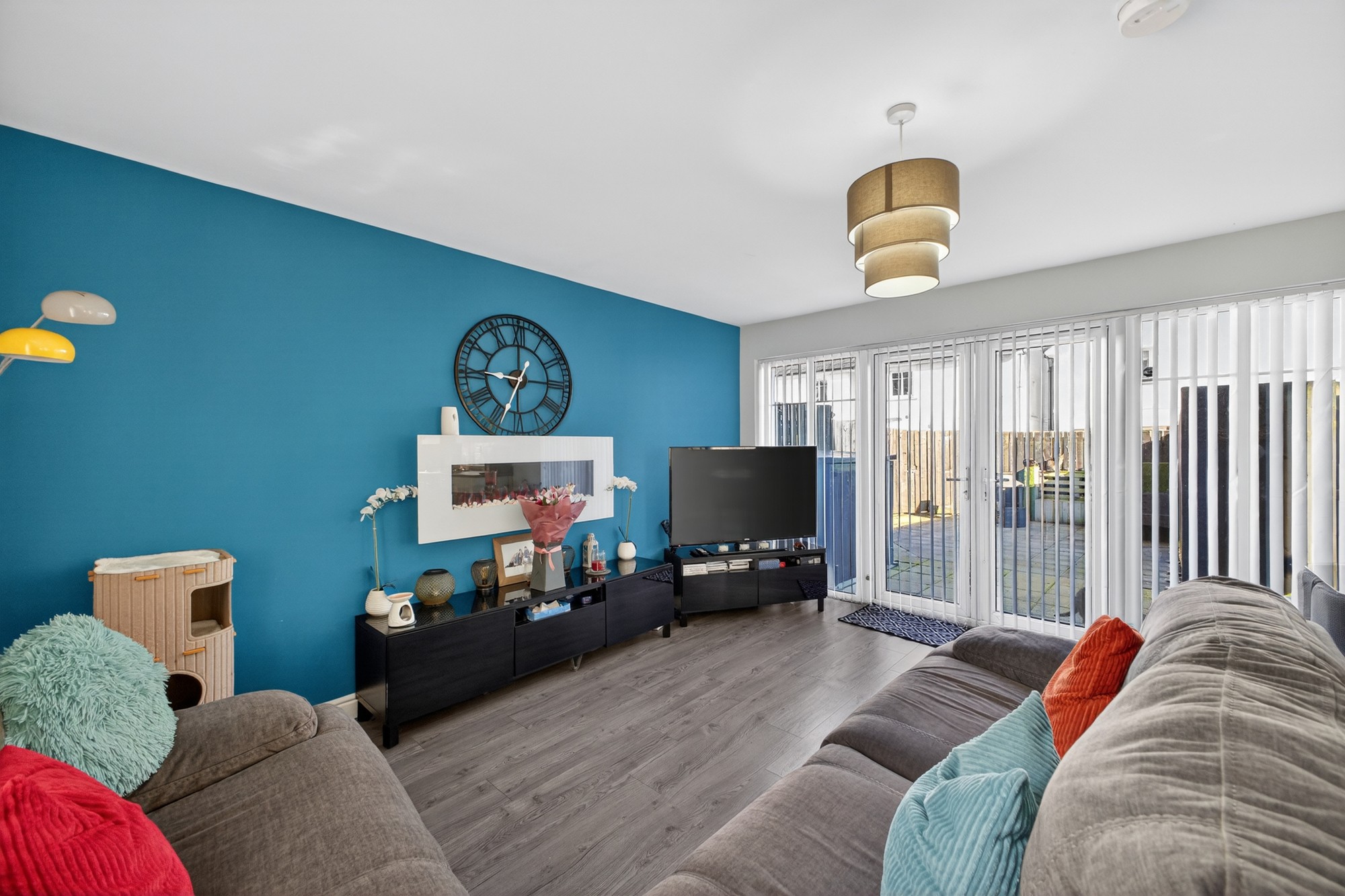 Superbly spacious living dining room opening into luxury fitted kitchen and with double pvc door access out to generous enclosed paved yard.