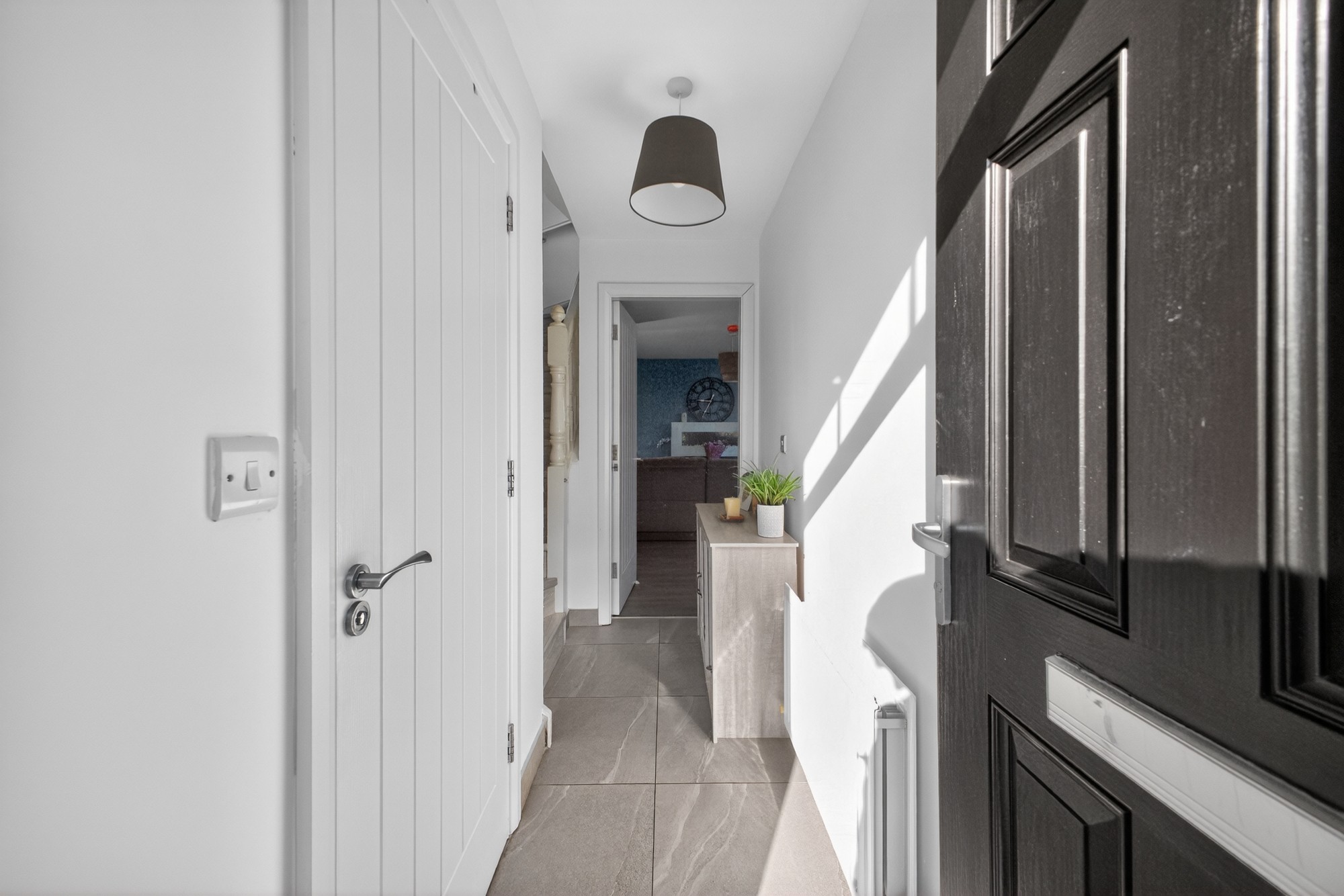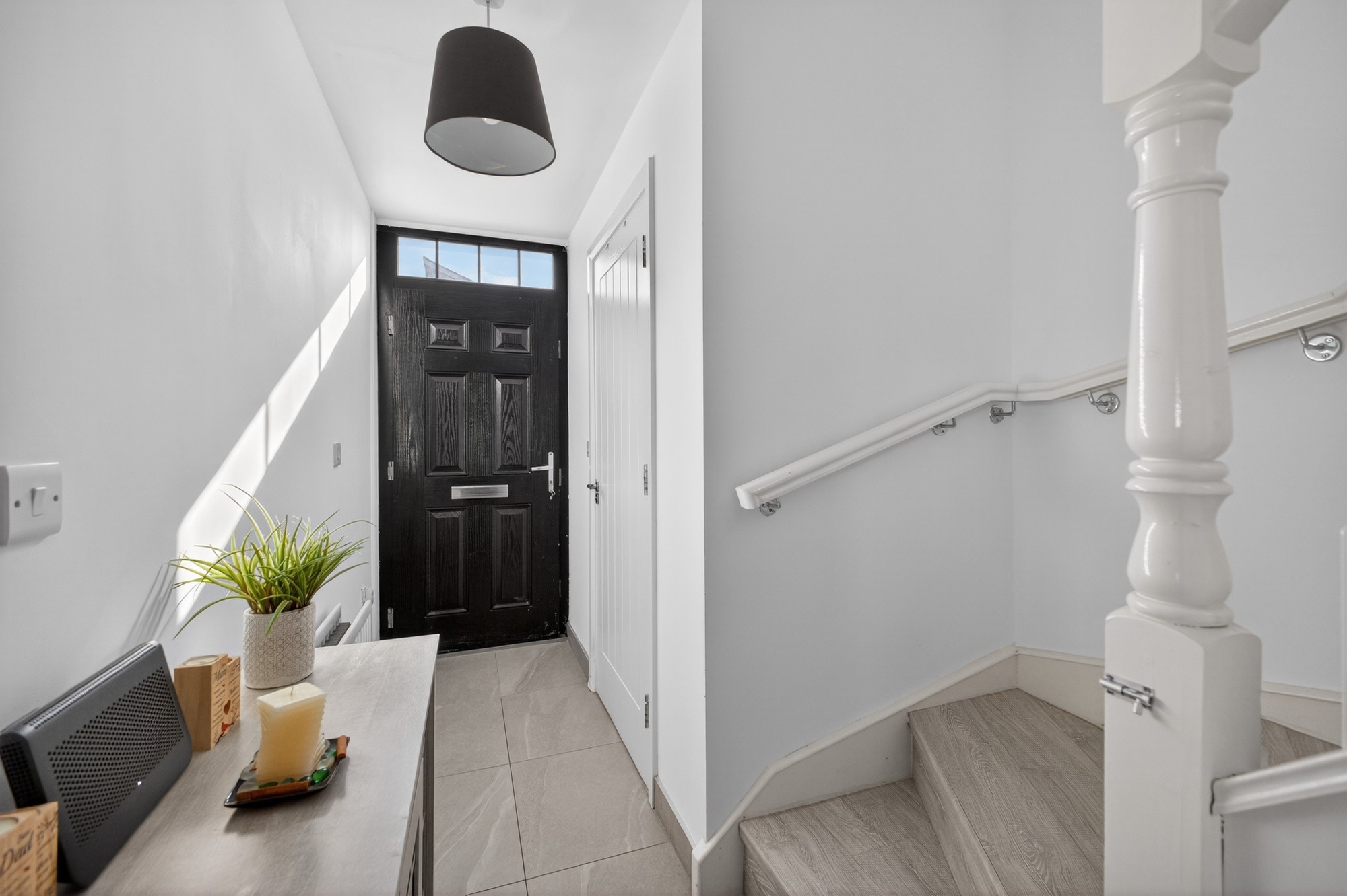 Bright and airy hallway in ceramic tiled flooring withy access to storage cupboard and downstairs w/c.