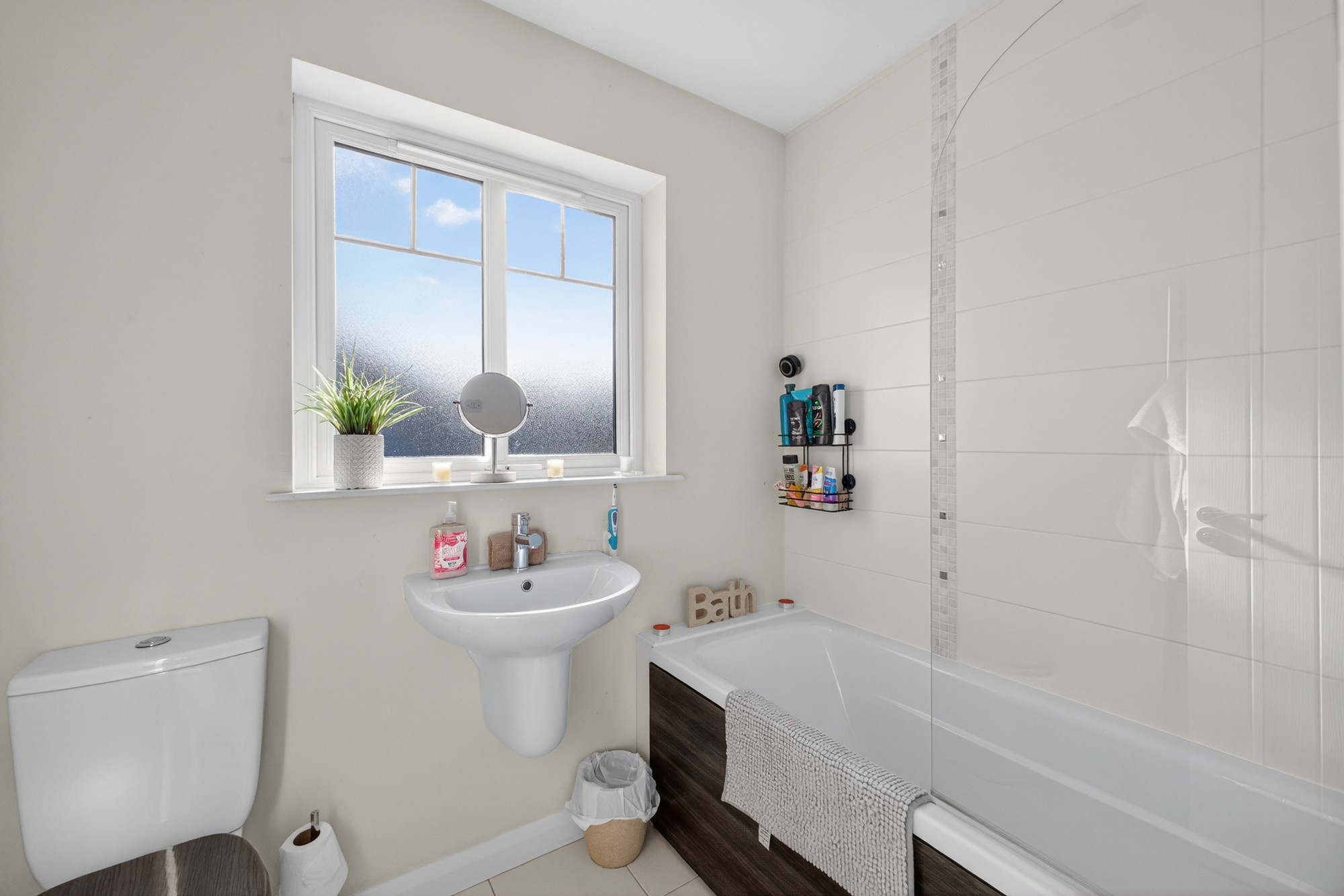 Deluxe fitted three piece suite consisting of a sink, w/c and bath with mains shower, partial tiling.