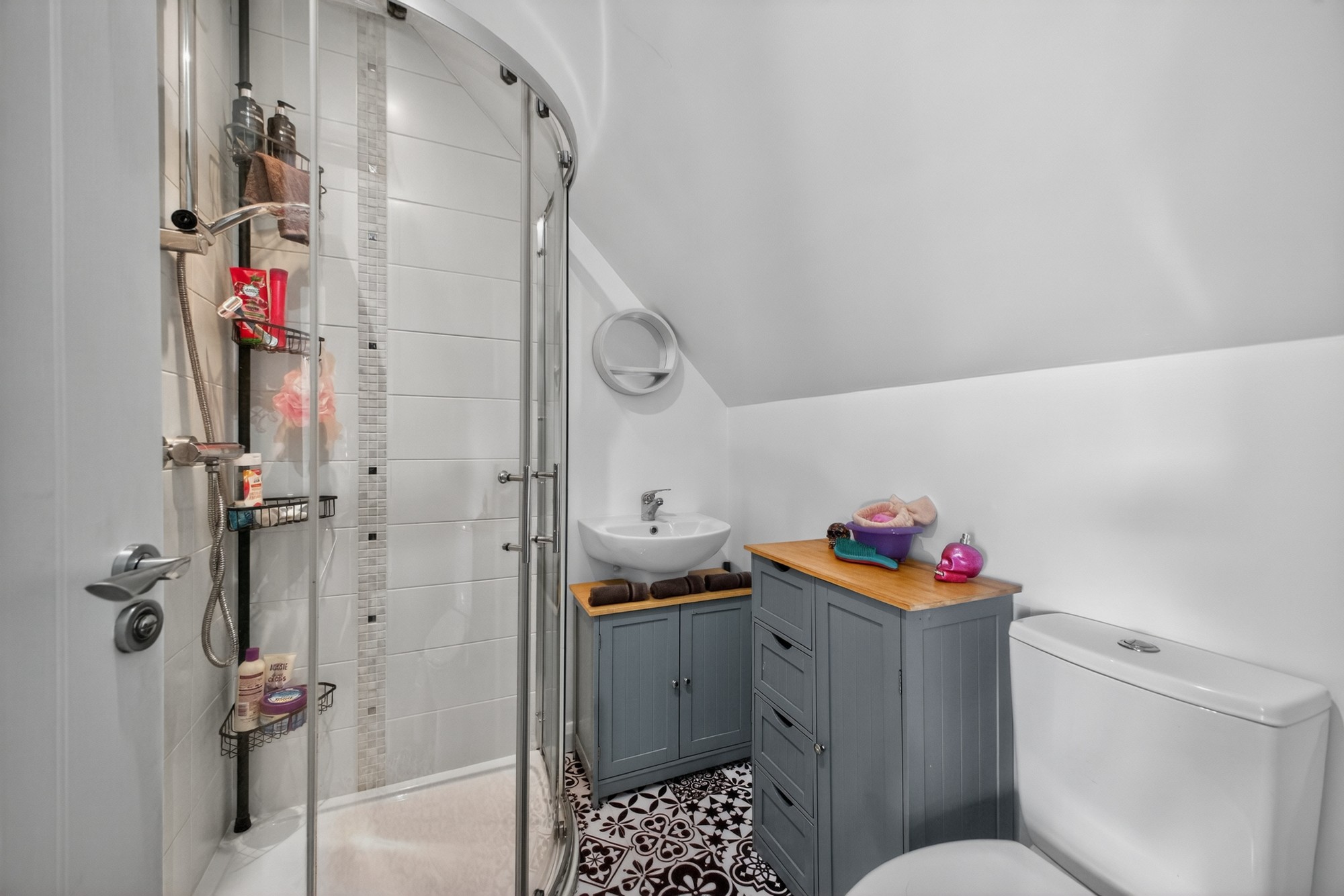 Deluxe fitted en-suite shower room consisting of w/c, sink and walk in shower cube with mains shower and partial tiling.