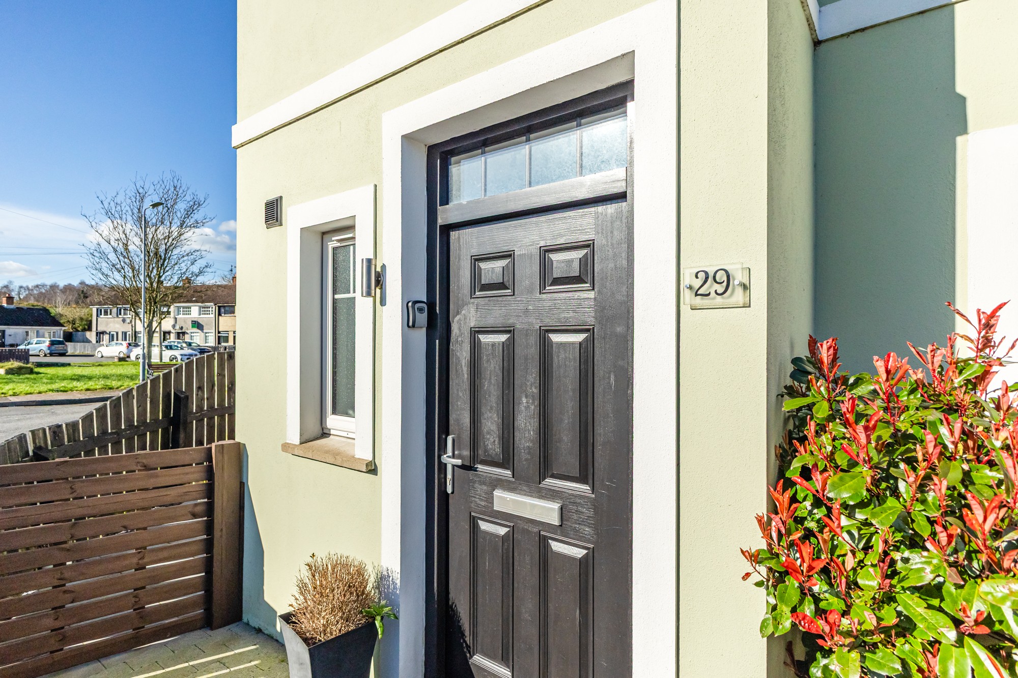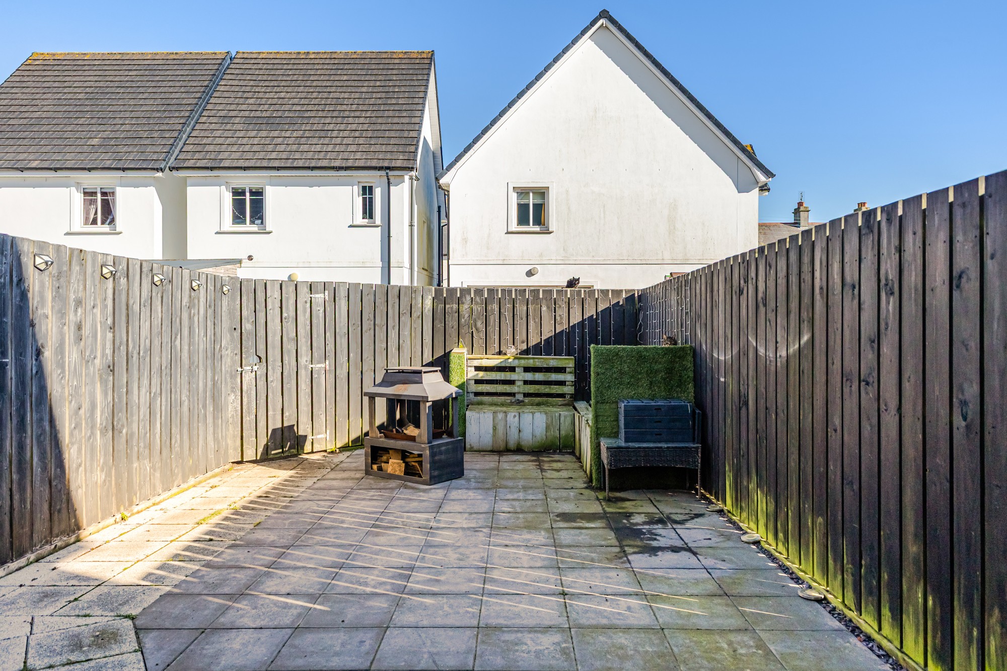 The front provides a path to the front door with small fencing and gate allowing access to the side.