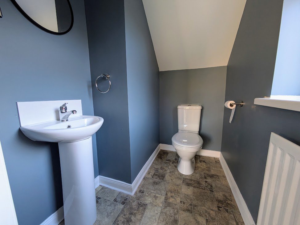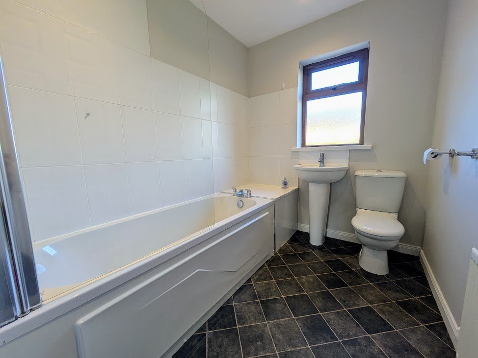 Modern White suite comprising: pedestal wash hand basin, close coupled w/c and panel bath with Mira Shower unit and shower screen, part tiled walls, recessed spot lighting, extractor fan.