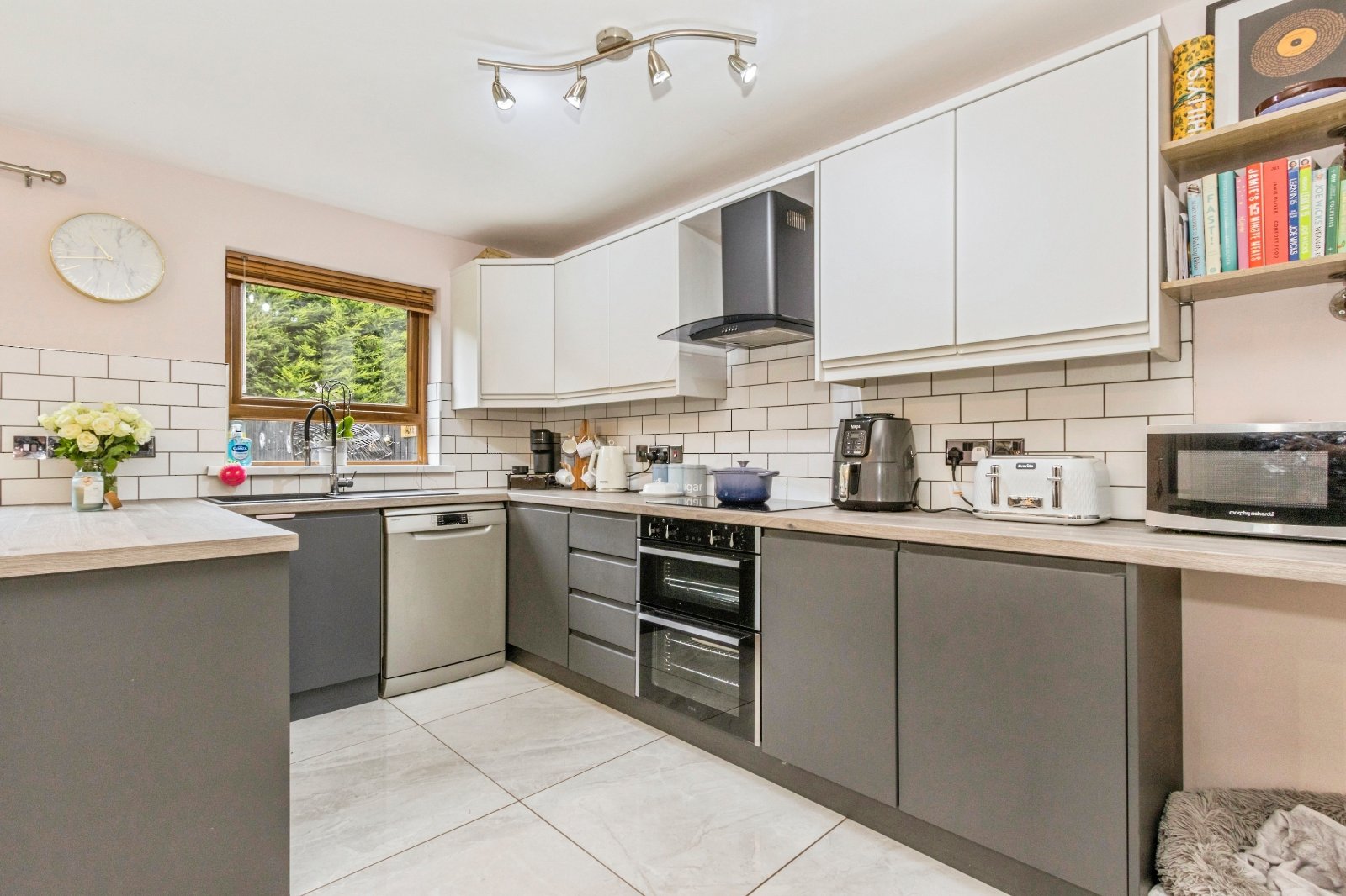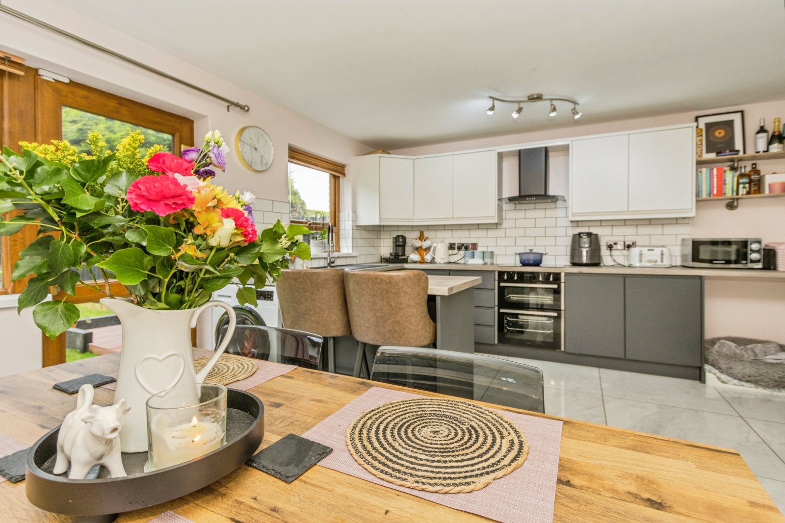Single drainer composite sink unit with mixer taps, excellent range of high and low level units with laminated work surfaces, built in double oven and 4 ring ceramic hob, extractor fan, plumbed for dishwasher and washing machine, breakfast bar, part tiled walls, ceramic tiled floor, casual dining area, uPVC double glazed door to garden.