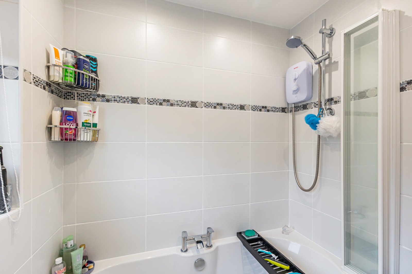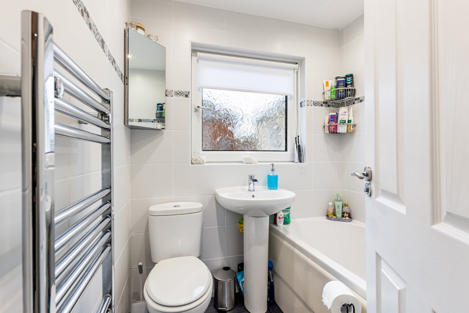 White suite comprising : Panelled bath with stainless steel mixer taps and shower unit,, dual flush WC, pedestal wash hand basin, tiled floor, fully tiled walls, chrome towel radiator