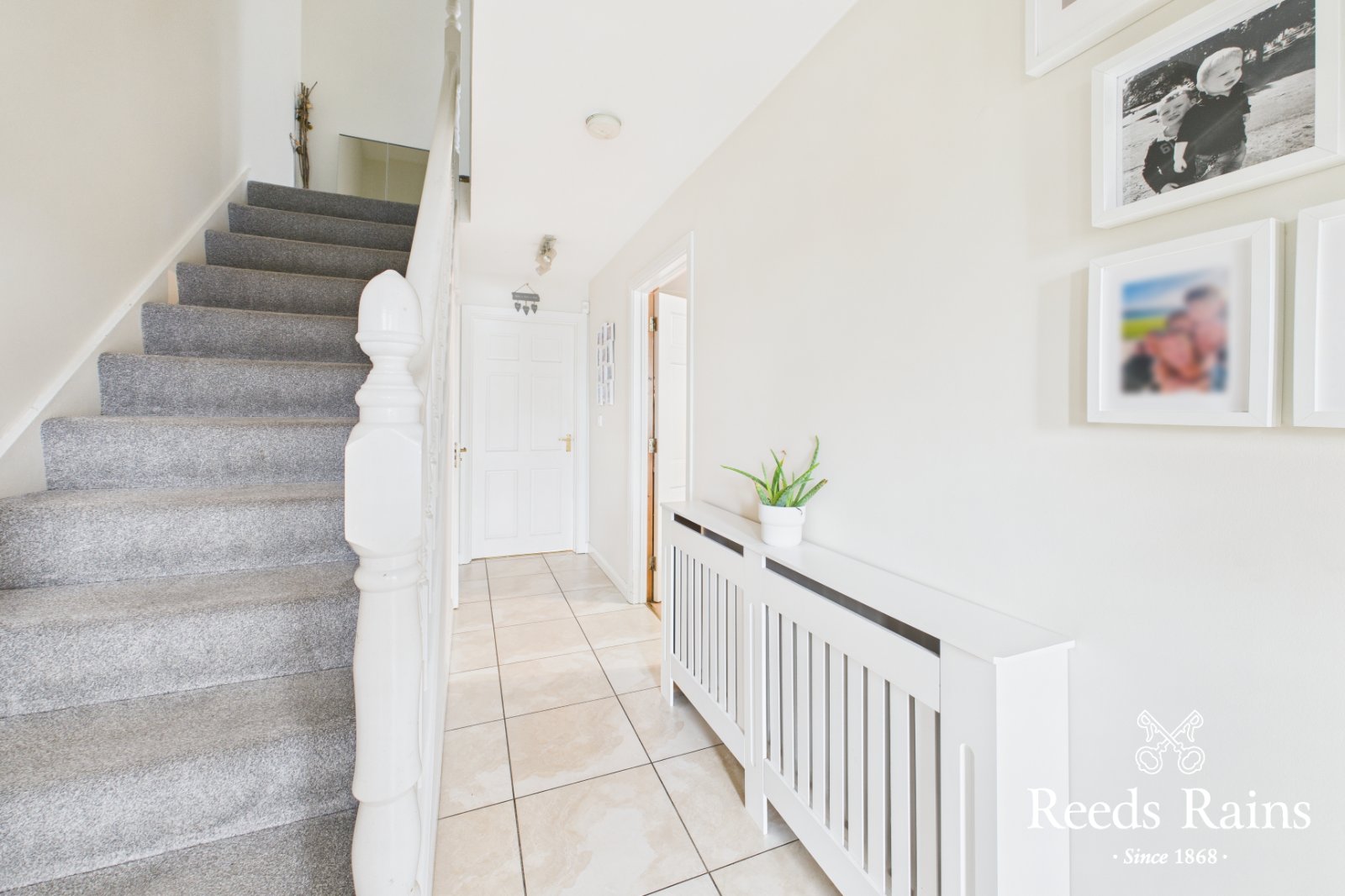 Composite front door, double glazed side panels, ceramic tiled floor.