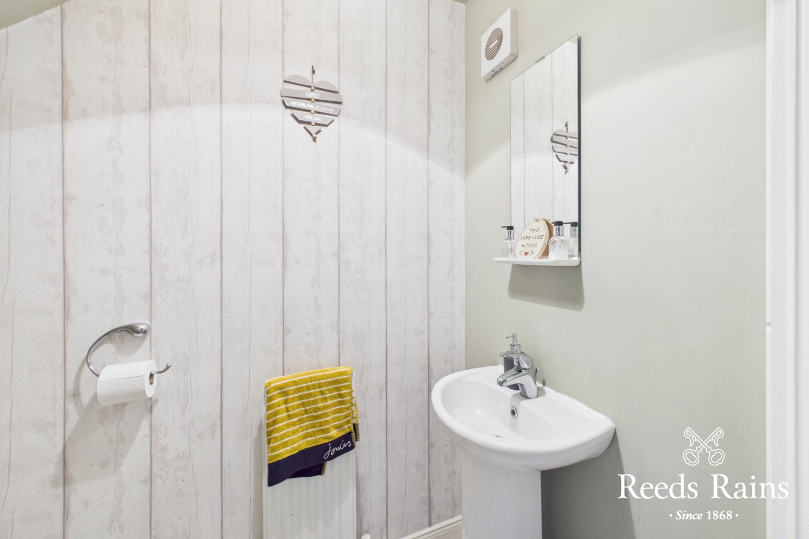 White suite, dual flush wc, pedestal wash hand basin with mixer taps, extractor fan, ceramic tiled floor.