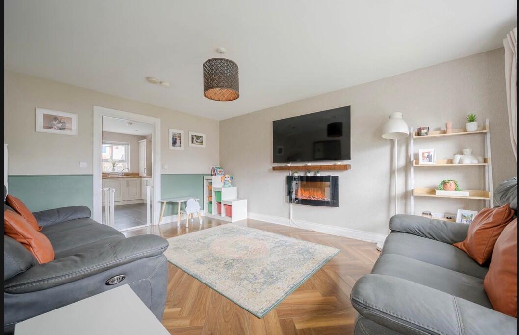 Living Room with Feature Herringbone Style Laminate Wood Effect Floor
